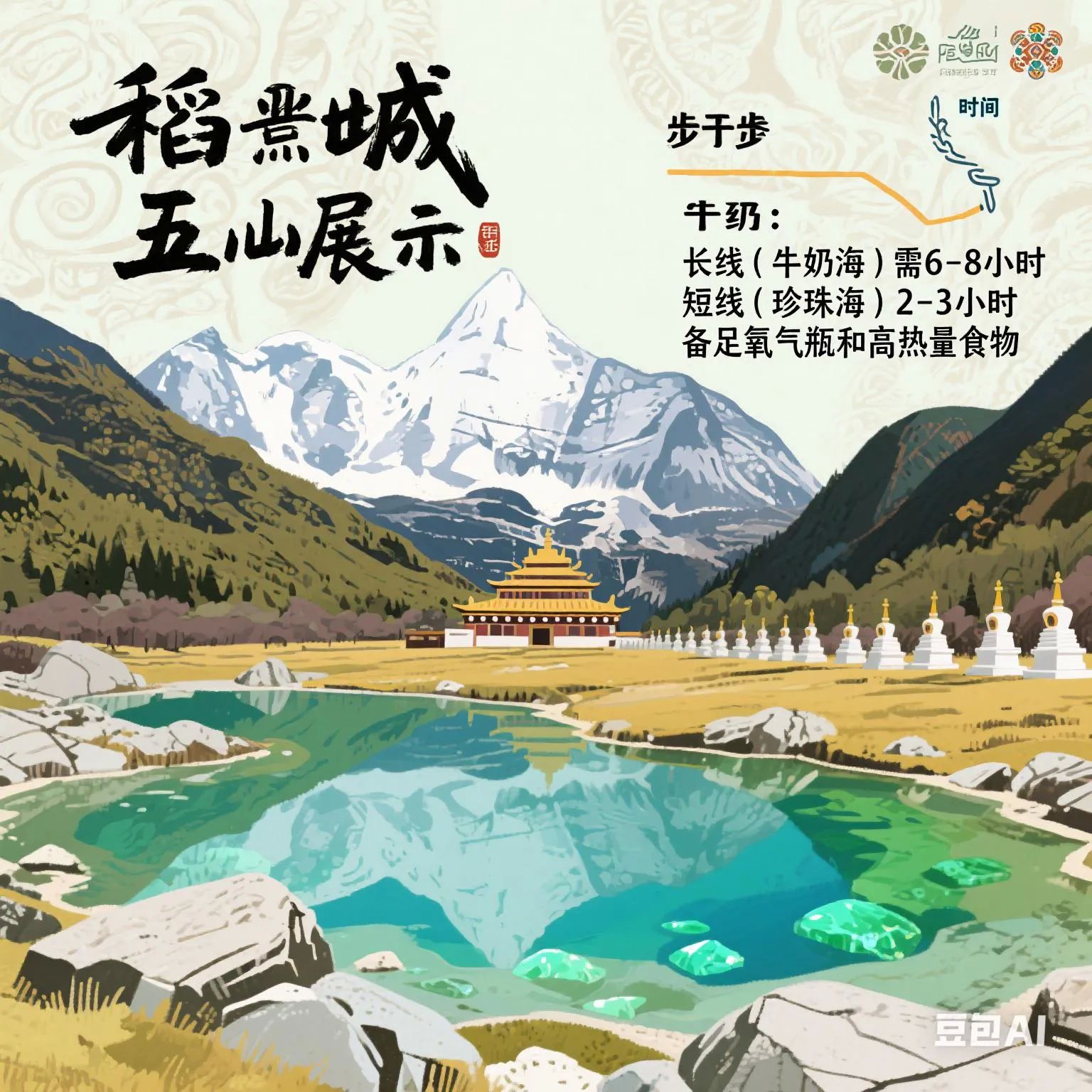 **徒步建议**:长线(牛奶海)需6-8小时,短线(珍珠海)2-3小时,备足氧气瓶和高热量食物。