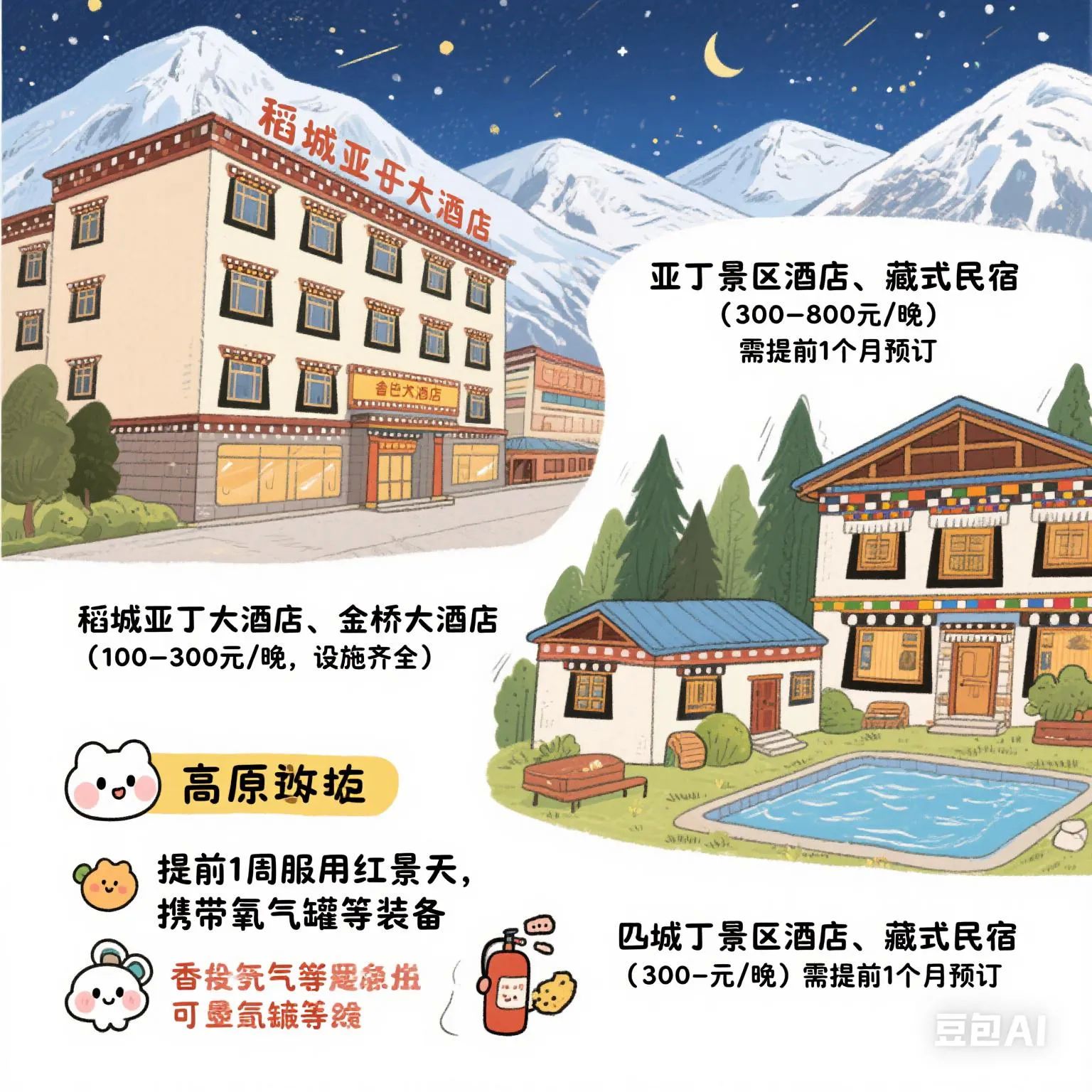 - 亚丁景区酒店、藏式民宿(300-800元/晚),需提前1个月预订。
