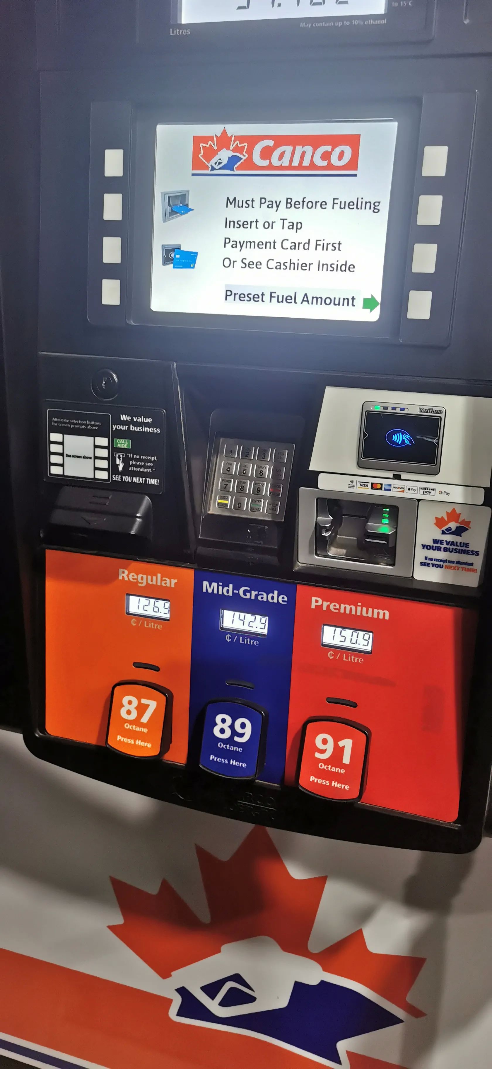加油站汽油分为87号、89号、91号三级,品质大致对应国内92号、95号、97号,单价略高于国内油价。在加拿大整体物价水平显著高于国内的背景下,油价反倒显得“亲民”。值得注意的是:自助加油比人工服务每升便宜约0.1-0.2加元,动手能力强的驾驶者可借此节省开支。