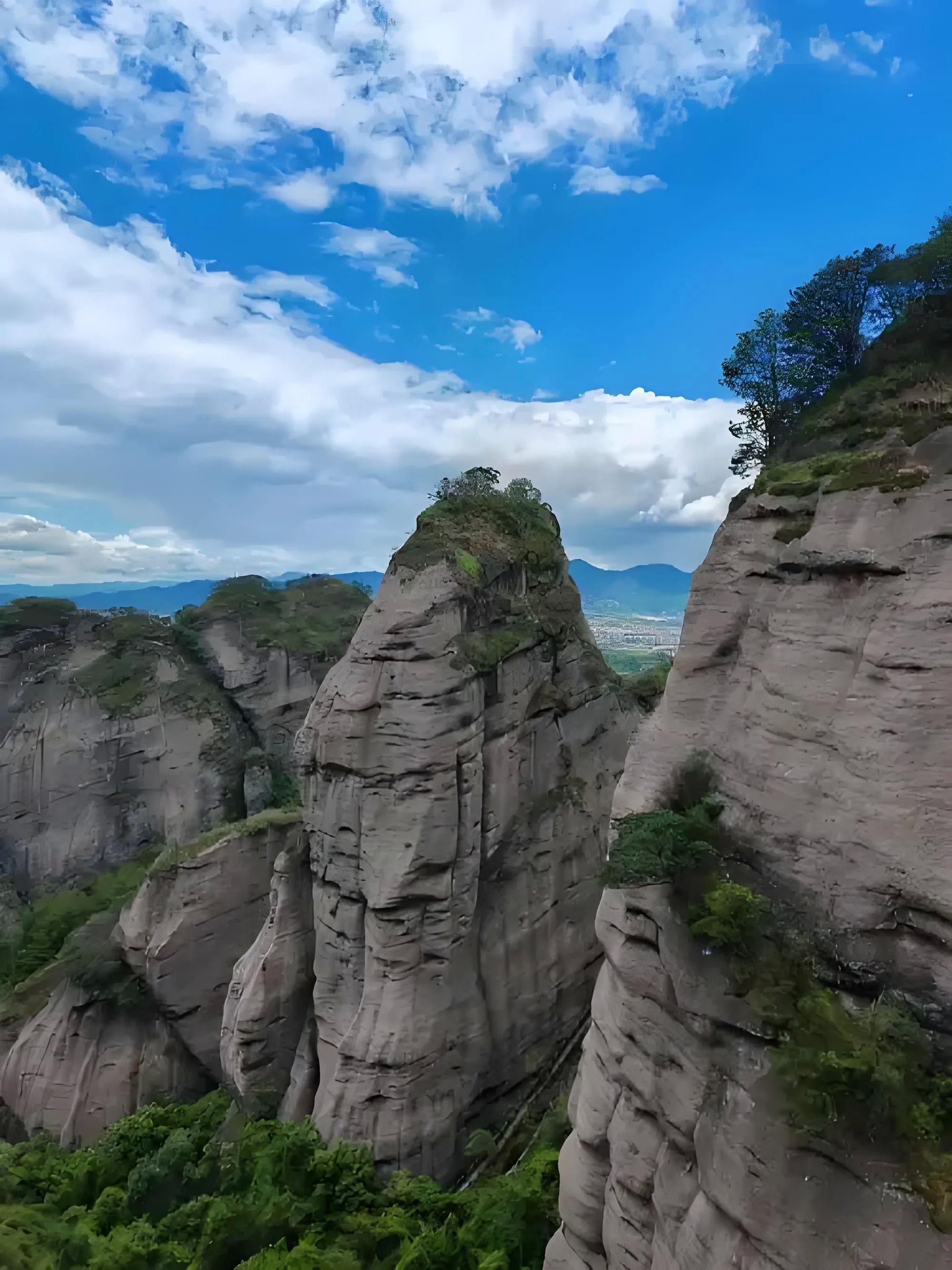 这堪称地质界的“显眼包”,站在群山之间,直接把周围的山峦树木都衬成了路人甲。别的山峰还在靠云雾凹仙气,它倒好,以一己之力扛起整座山的话题度!凑近一看更是绝了,这浑然天成的造型,连毕加索看了都得直呼“这题超纲了”!最绝的是石柱顶端那棵“倔强小树”,仿佛在疯狂暗示:“看到没?这就是生命的力量,主打一个不服输!”