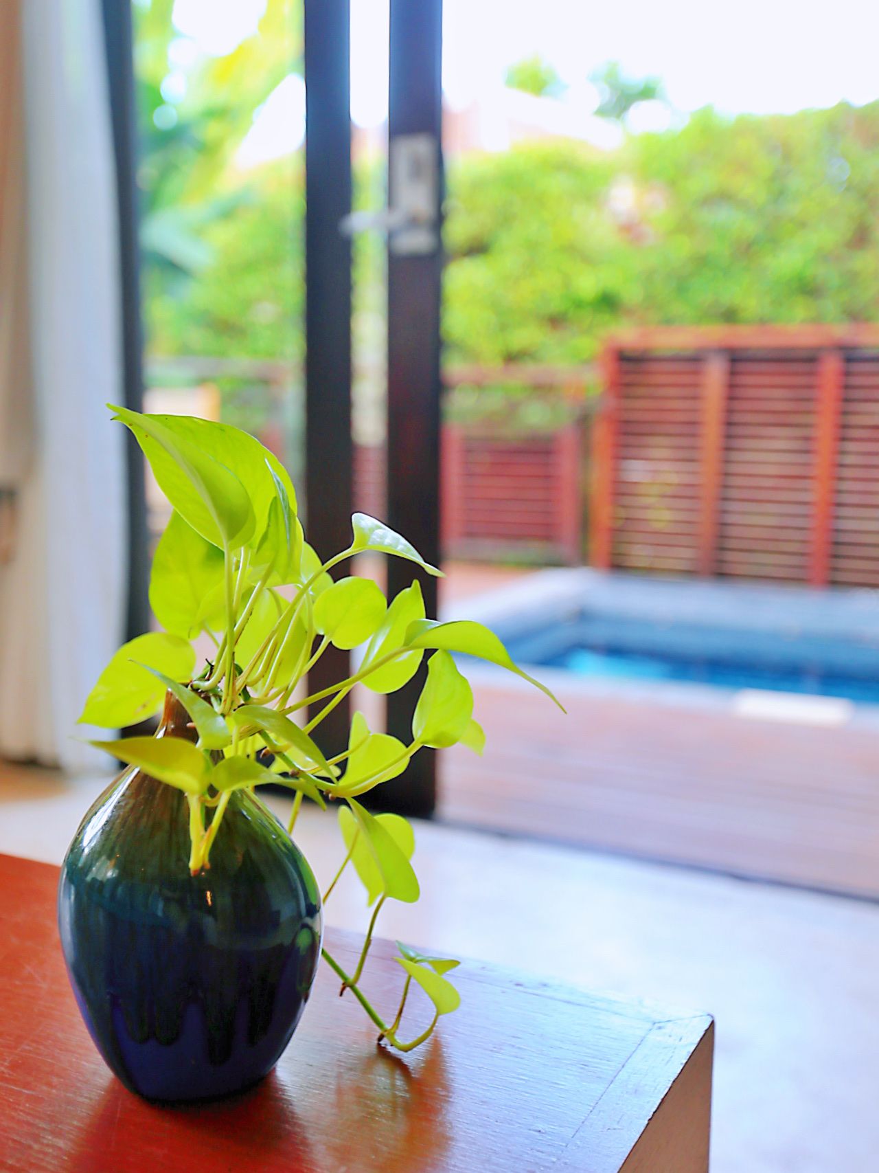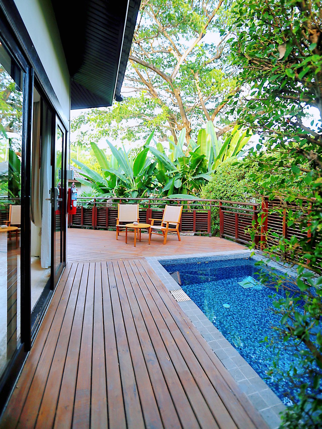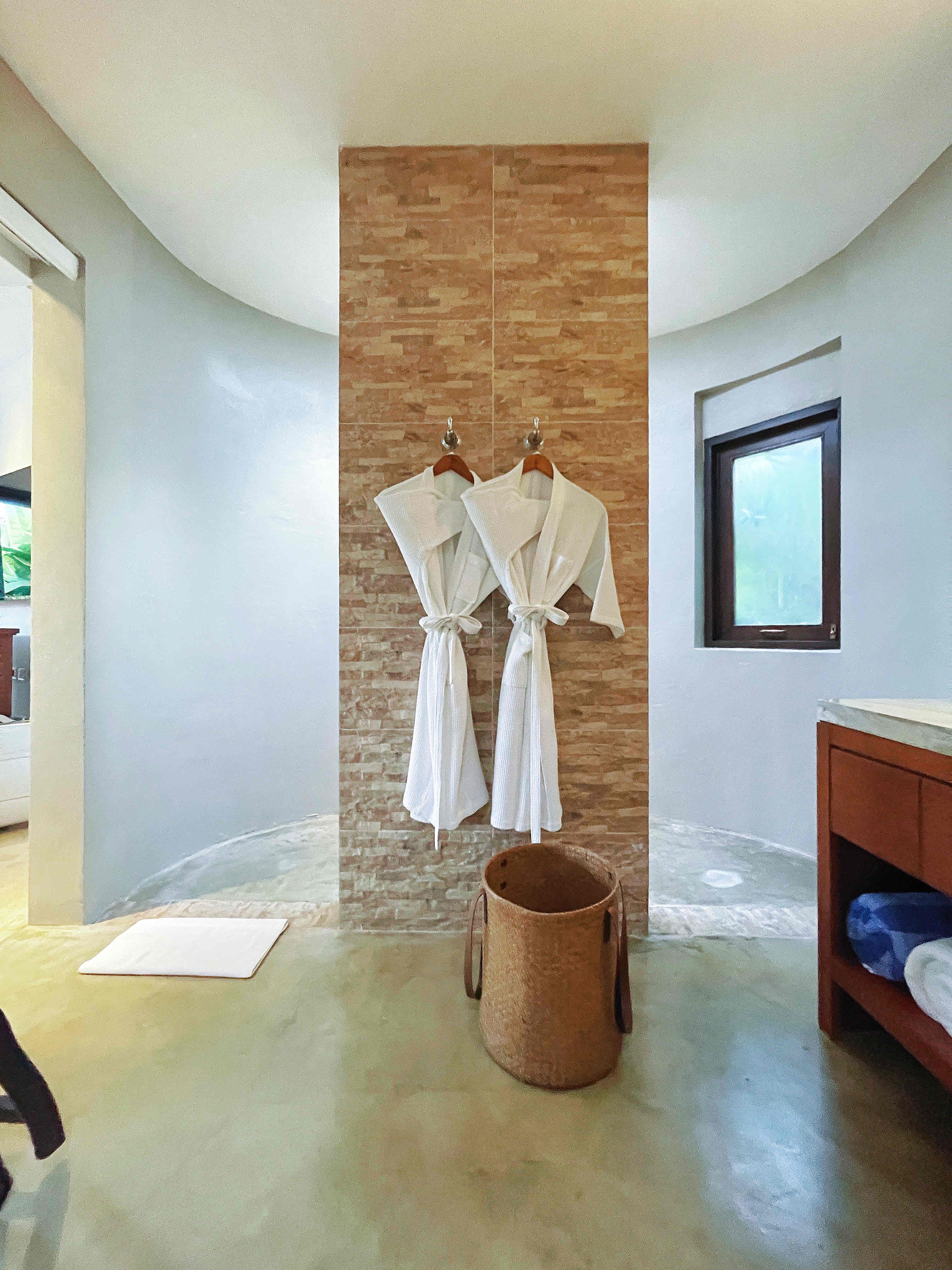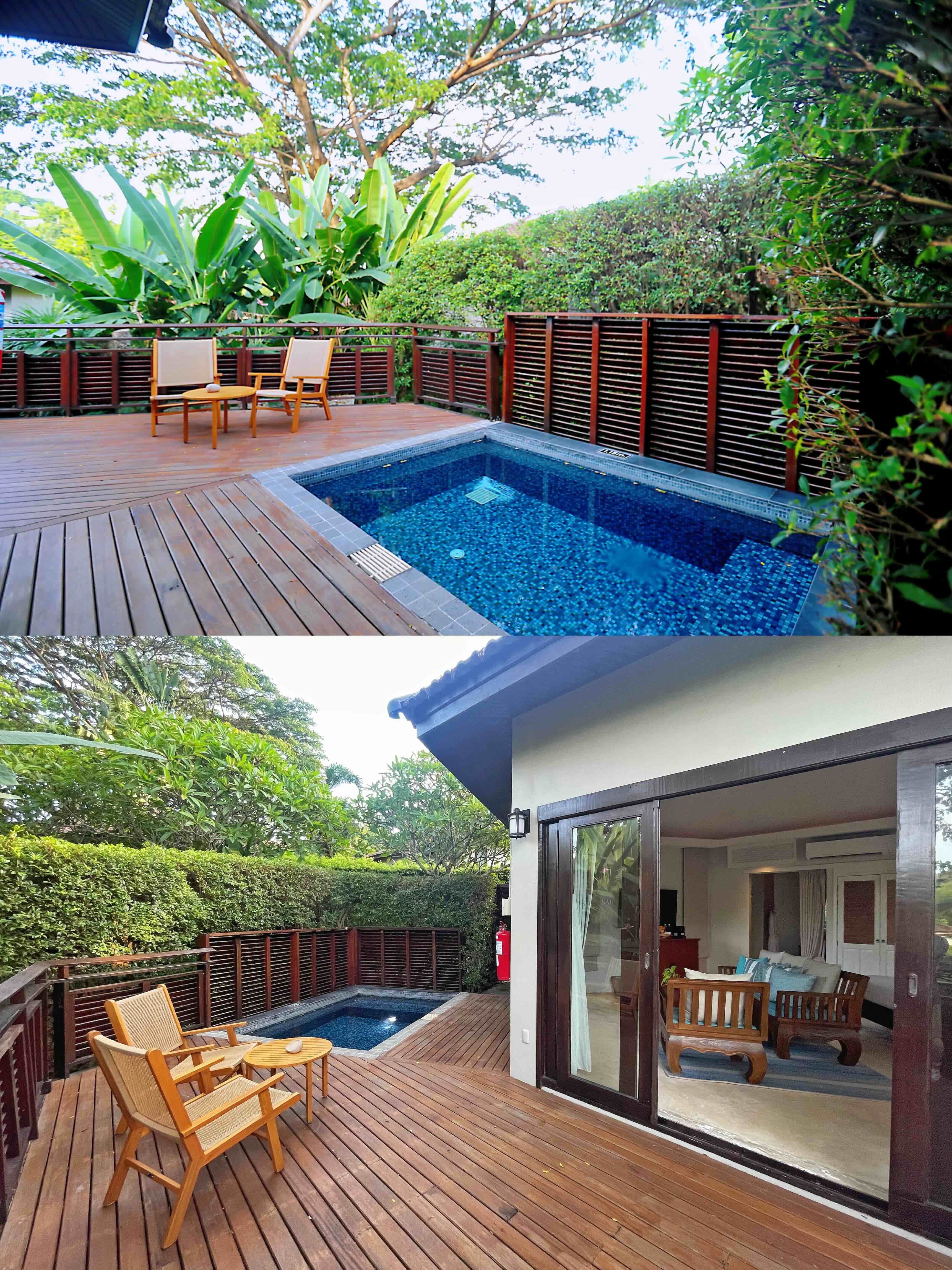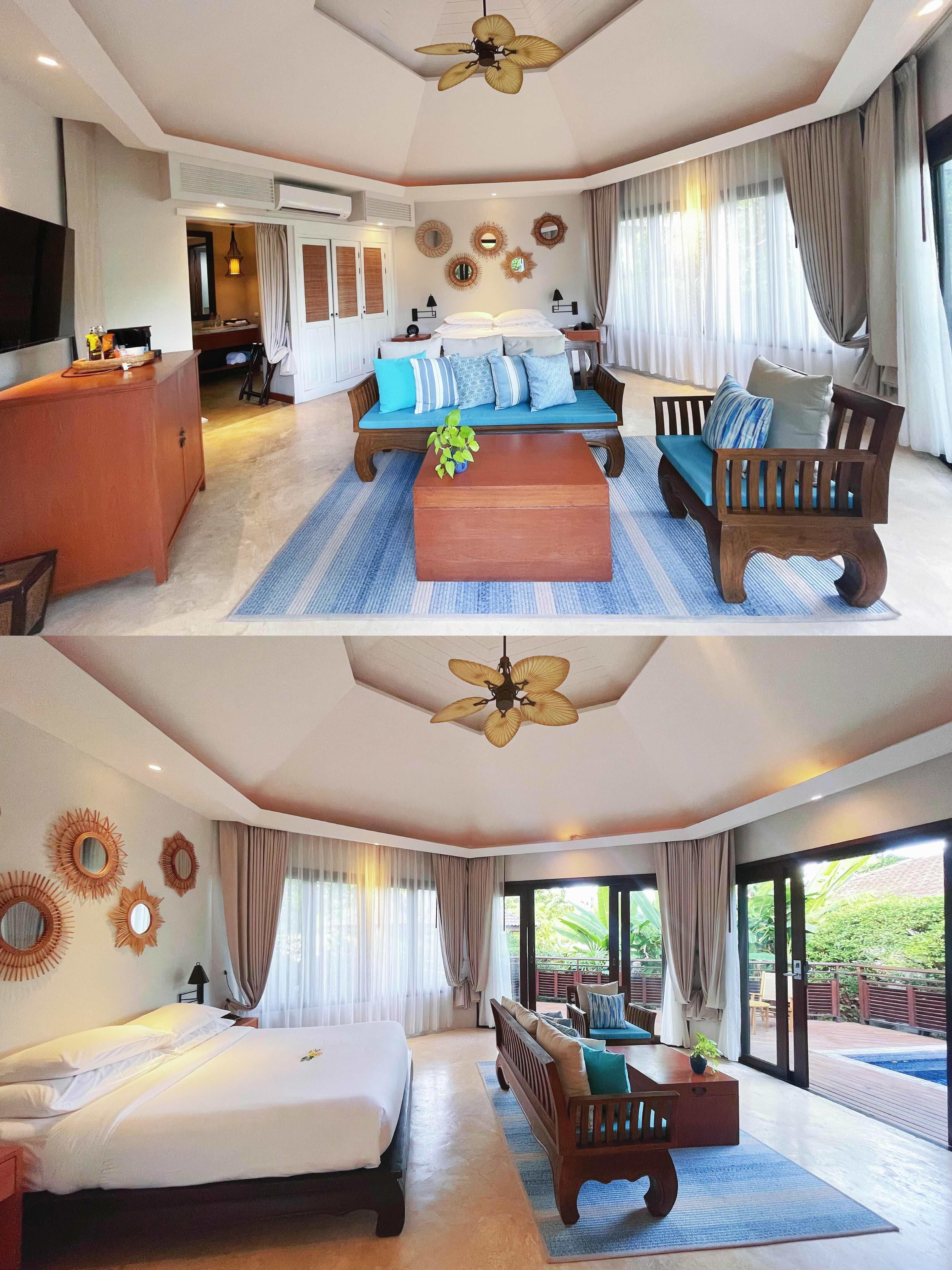 在前台办理入住后,穿过竹林小径,别墅群就掩映在这片葱郁绿荫之中。推门而入是户外露台,独享的私人泳池可以全身心沉浸于自然美景之中。别墅采用开放式设计,全景落地玻璃推门与私人露台将室内空间扩展至户外,客房运用简洁而有目的性的手法,融入当代泰国元素,定制家具、泰式吊扇与海洋色彩装饰营造出轻松的室内氛围。