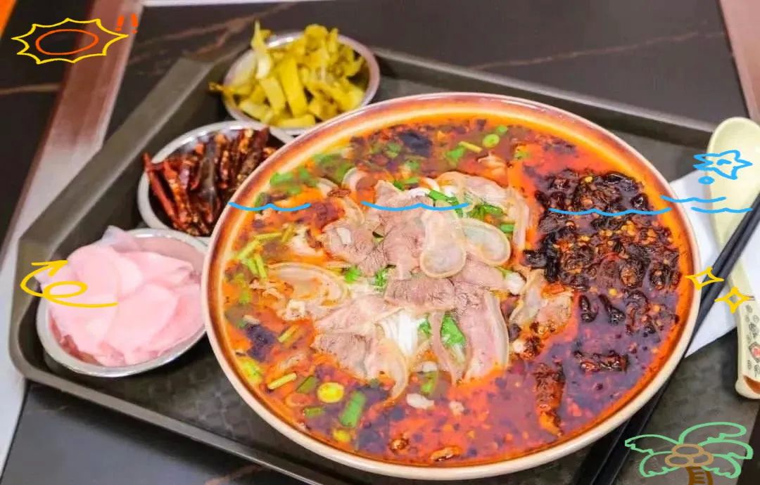 以黑山羊肉熬汤,配米粉、油辣椒、酸莲花白等,汤底浓郁,辣香鲜爽。