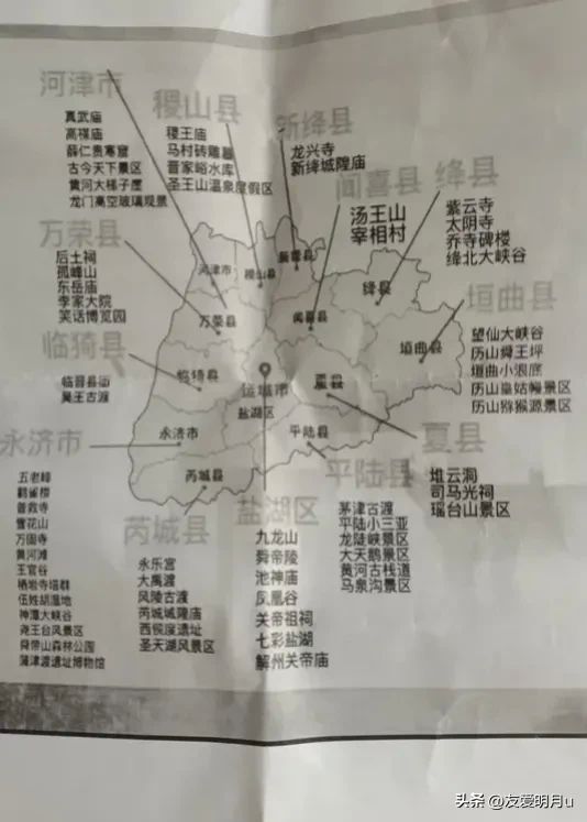 没想到小小的运城竟然有102处国保,有人说比北京都多,堪称全国第一,是不是第一我不知道,我买了年票,里面就有28处精华景点,这次游玩了十一个,以后有时间继续打卡,下图一是我住的酒店提供的运城景点图,图二是年票包括的景点!#秋日生活打卡季#