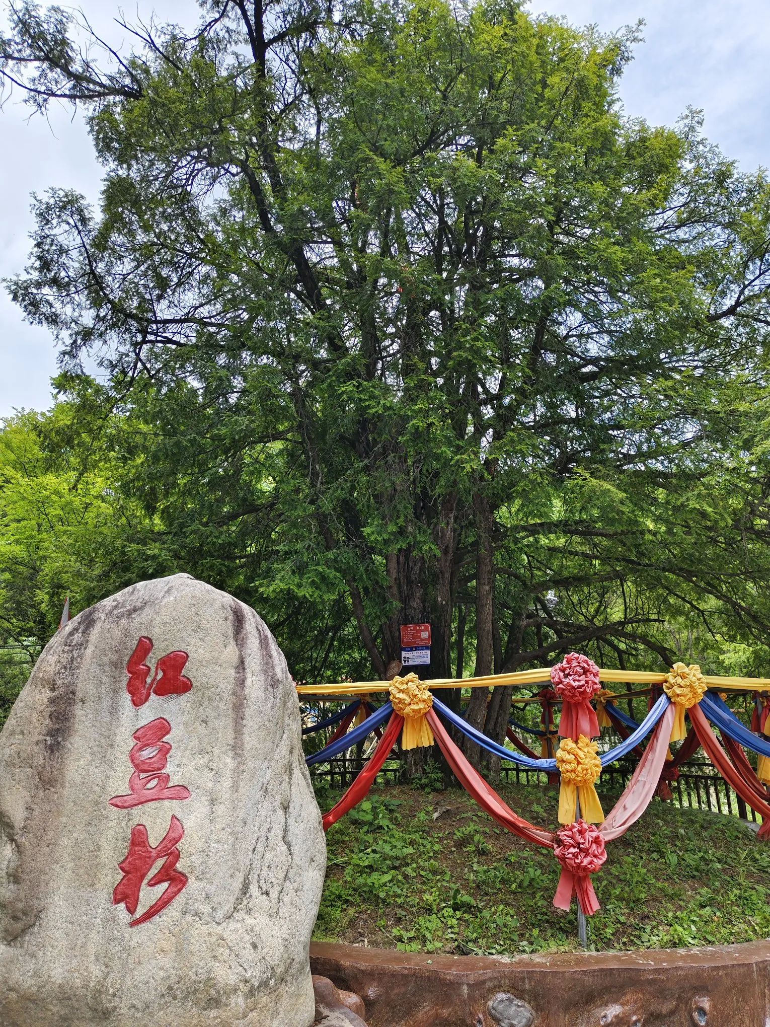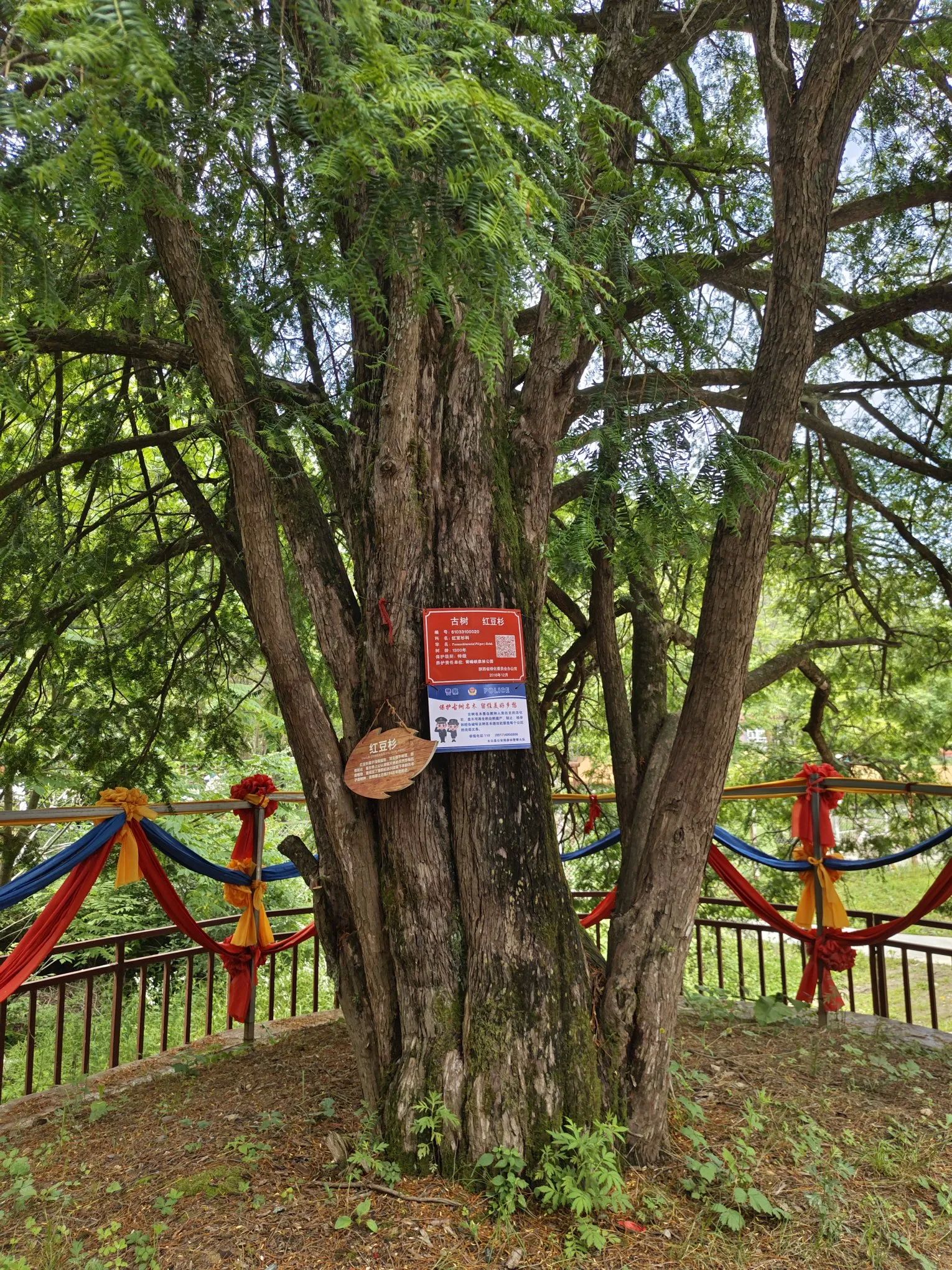 走个五百来米,就到了千年红豆杉的地方,一株一千三百年古树,长的是高大茂密。从这里坐电瓶车上去,下车后就是一个高大几十米的瀑布,看着很不错。