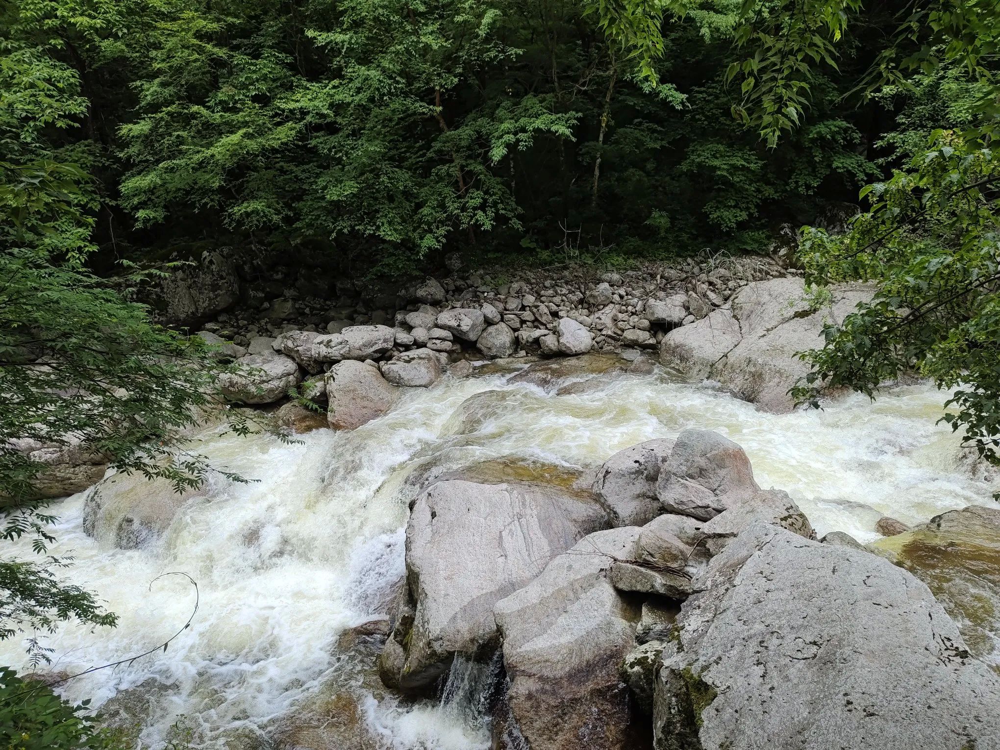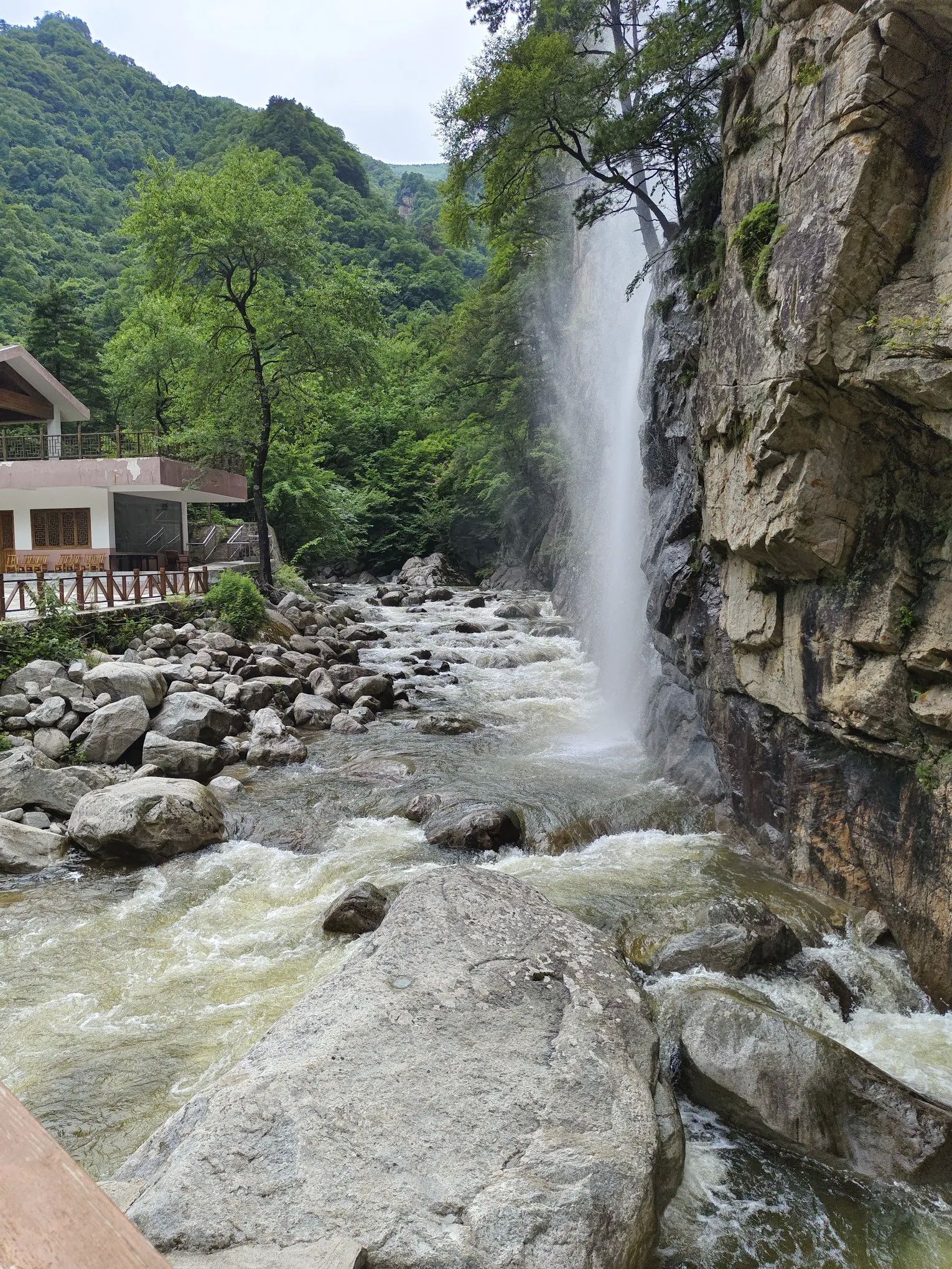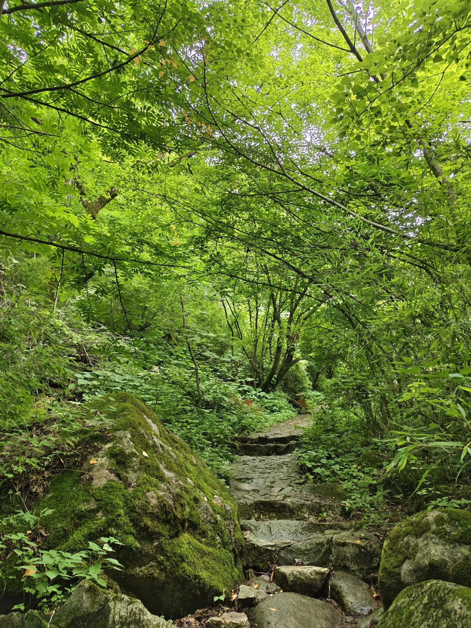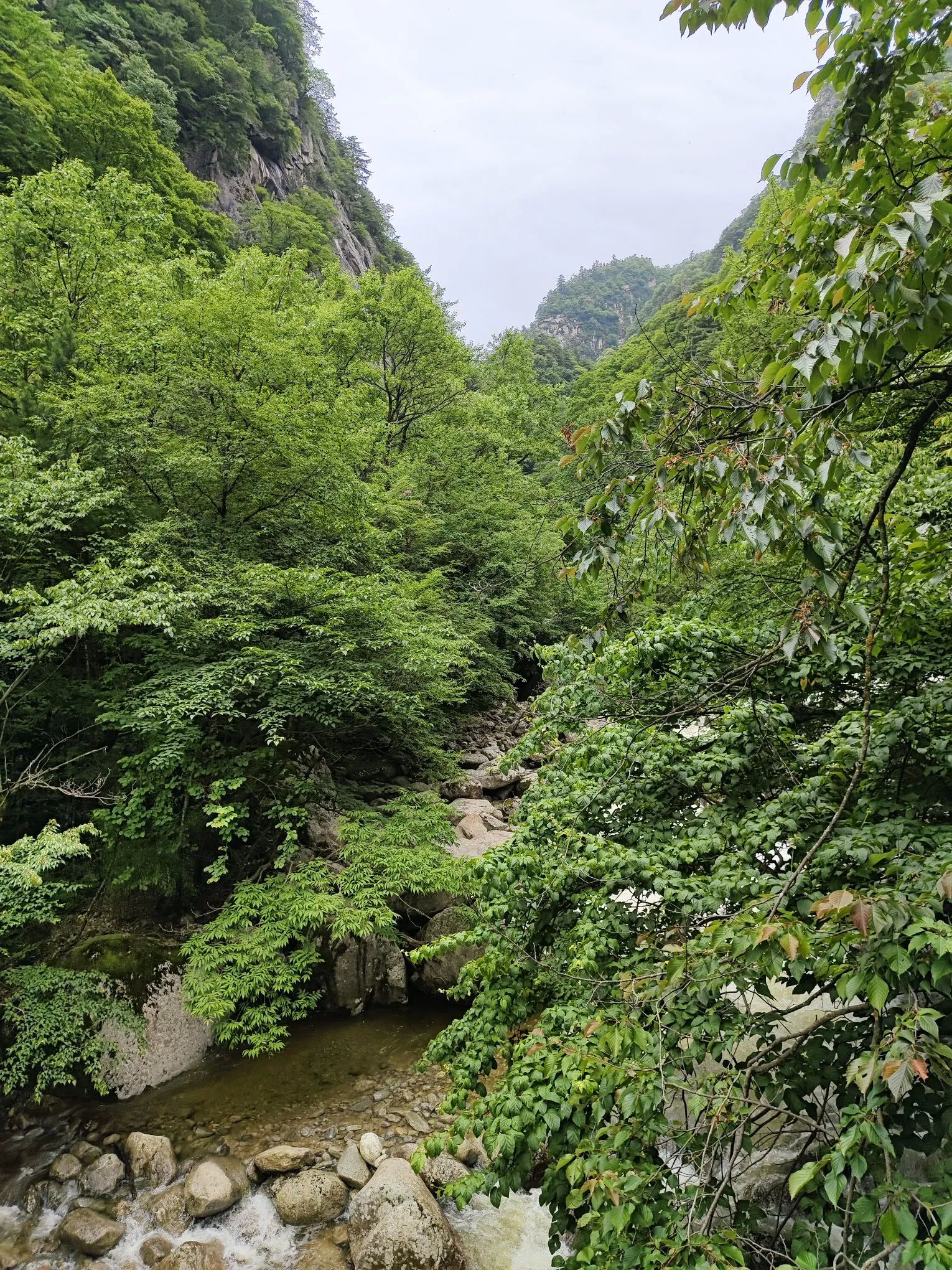 接着往上去神女峰景点,有左右两条路,中间夹着河流,河水很大,冲击的声音也很大。从左边上去,路面相对原始一些,树木更茂盛。一路走来,非常凉快。中间搭了个吊床,躺了不到半个小时,最后反而是觉得太冷[捂脸]。继续往上,走到吊桥那里,可以穿过河流,走到右边的路上,然后返回到两条路交汇处,还可以继续去雾瀑崖景点。