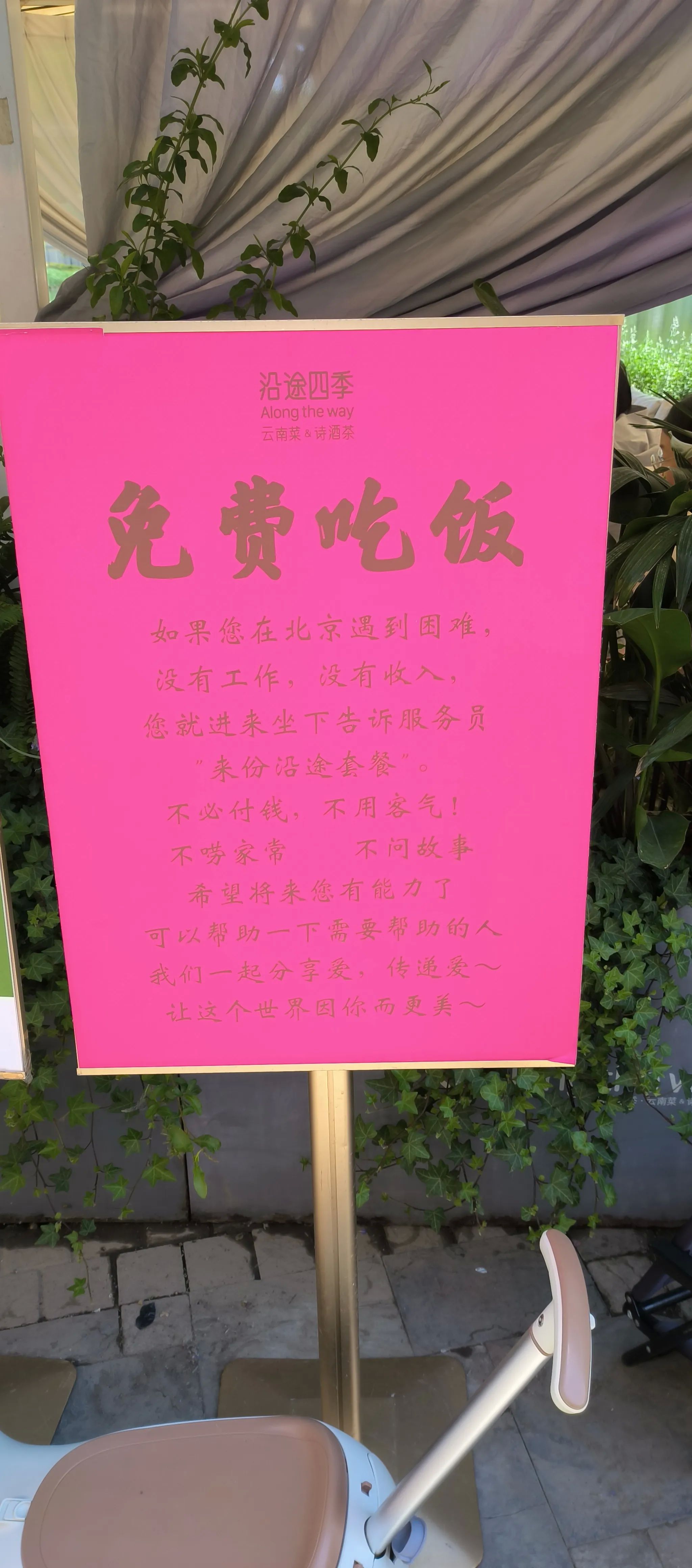 餐厅门口贴着一张《免费就餐》的告示,引起我的注意:“如果你在北京遇到困难,没有工作,没有收入,你就进来坐下告诉服务员:来份沿途套餐,不用付钱,不用客气!不唠家常,不问故事。