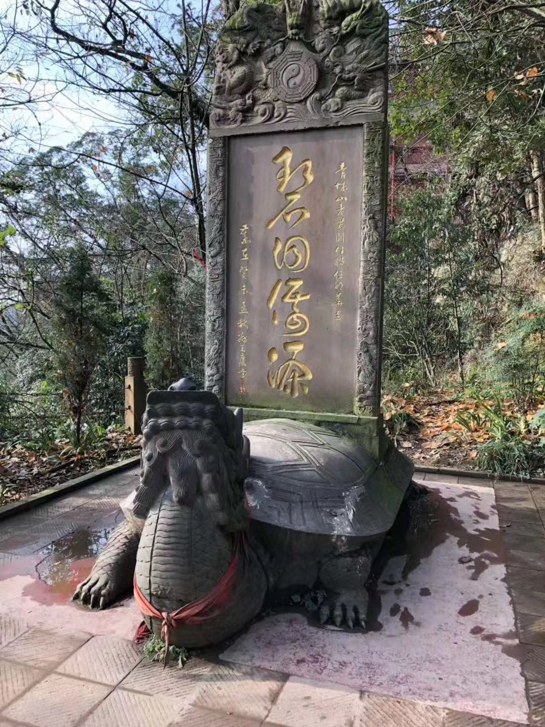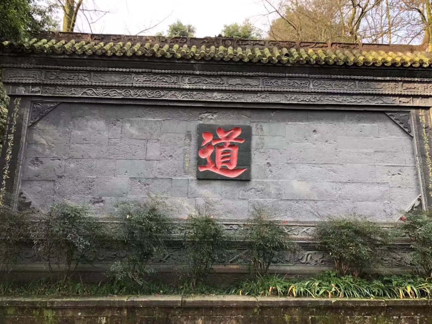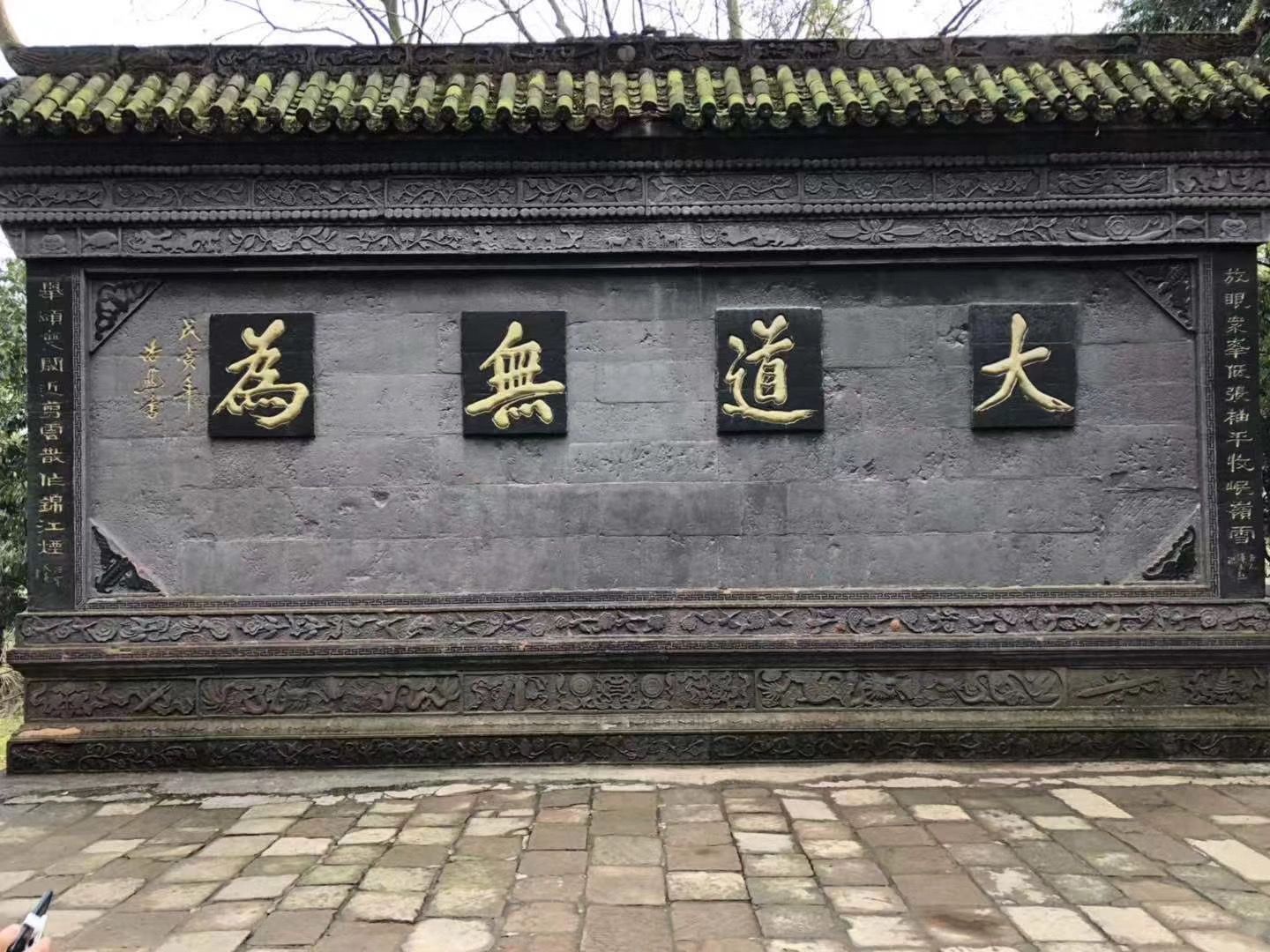 在刻有朱砂"道"字的石墙前驻足,惊觉阴阳在此具象——黛瓦鳞片暗合太极鱼纹,金漆楹联笔锋如剑气直指苍穹。转至"大道无为"照壁,黑色玄武岩上的鎏金篆书与石雕赑屃构成天地契约,系在龙龟颈项的红绸恰似道人朱砂笔下的点睛之符。