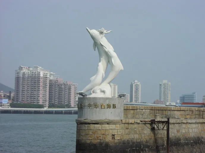 5.中华白海豚雕像。登上鼓浪屿,就会在轮渡码头上看到这个中华白海豚的雕像,不得不说,这是鼓浪屿的标志性雕塑。不过,这个标志因基座开裂,有进行过修缮,看来不管是雕像白海豚还是海里的白海豚都要好好去保护它们。