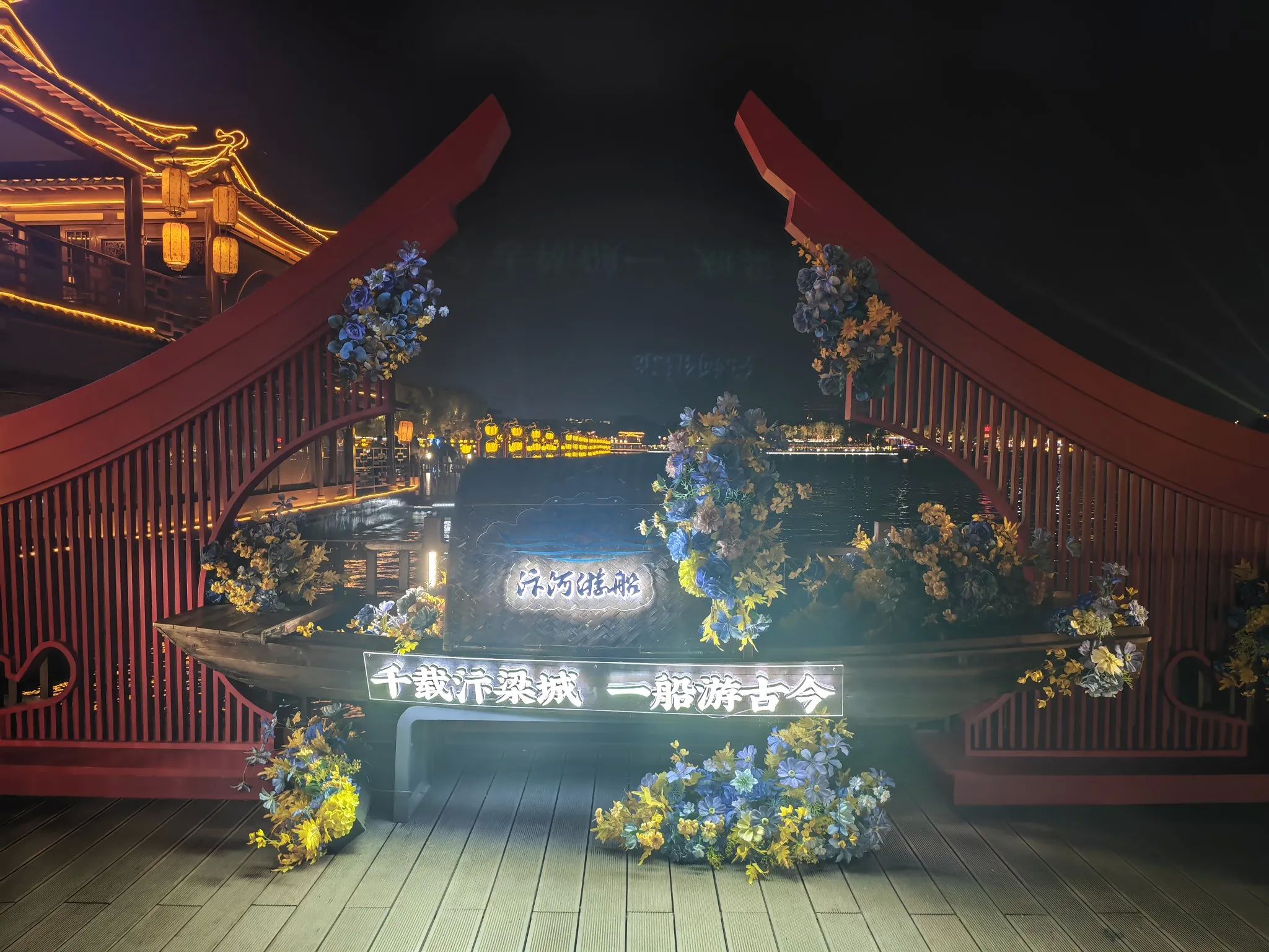 夜游清明上河园,还可以选择乘坐游船。在汴河上,乘坐大型梦幻游船,人在船上坐,船在画中游,品味《大宋·汴河灯影》。两岸的灯光与水中的倒影交相辉映,构成了一幅绝美的画卷,让人陶醉其中,流连忘返。