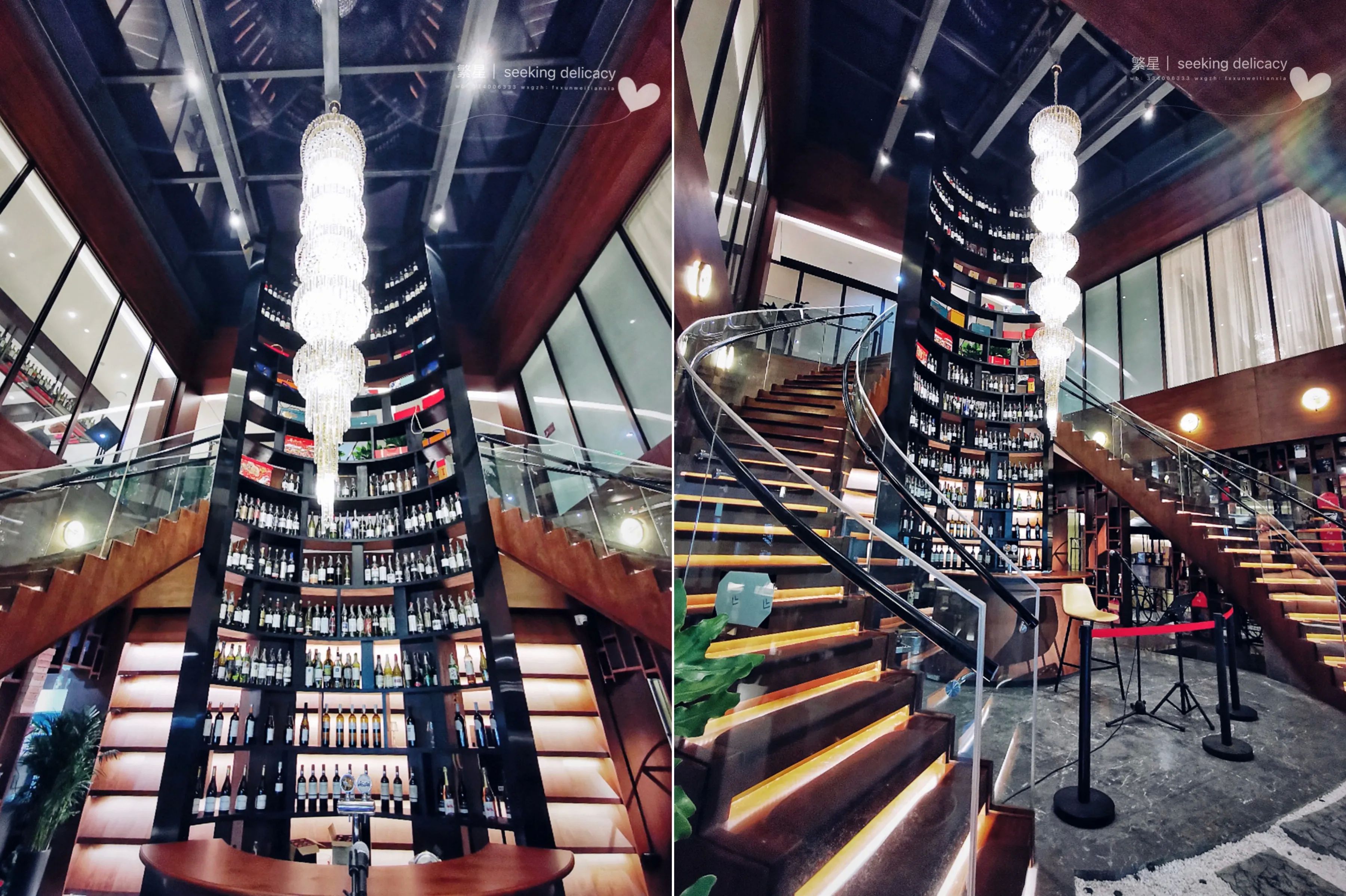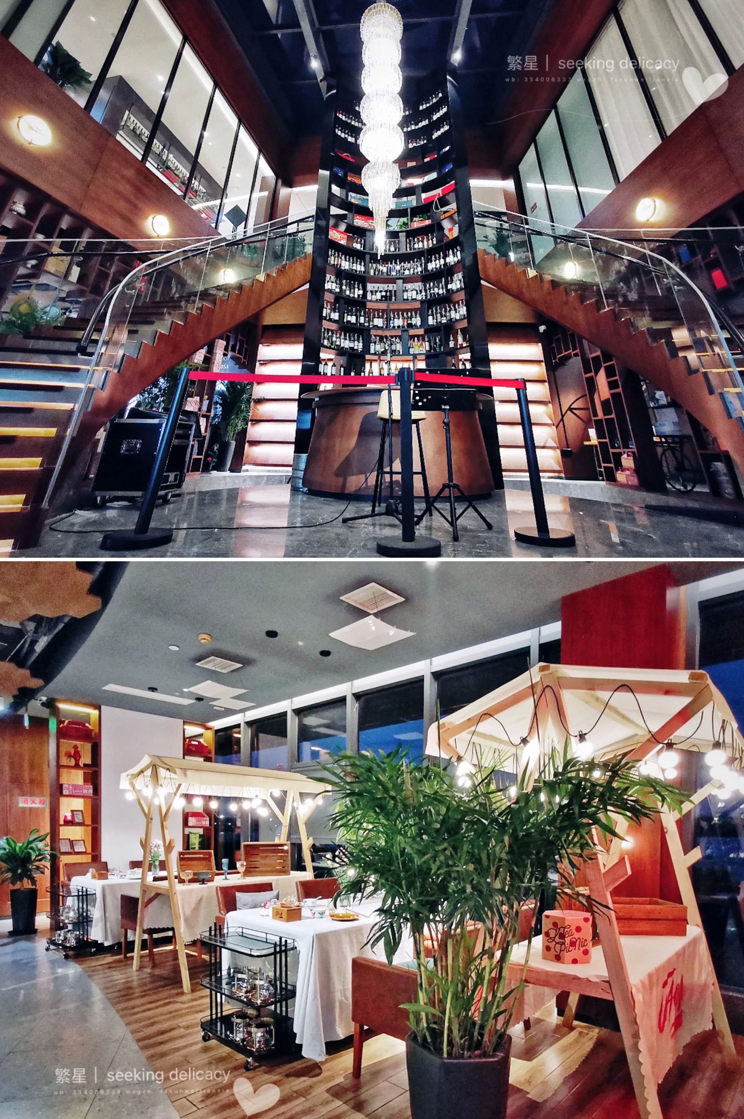 这真的是餐厅吗?!藏在园区的最深处,这栋极具设计感的建筑,就面对着九龙湖湖堤,外立面看着更象是一个展馆,进门竟然种满了各种蔬菜?博古架里摆满了各种可售物品?还有整排整排小货摊难道这里还是市集?那圆弧楼梯围包着的是通天的酒柜摆满了酒,那有那闪着霓虹的BAR,小火锅,二楼的包间空间大到开个大趴体都错错有余……就那么兜兜转转,我是差点迷了路。