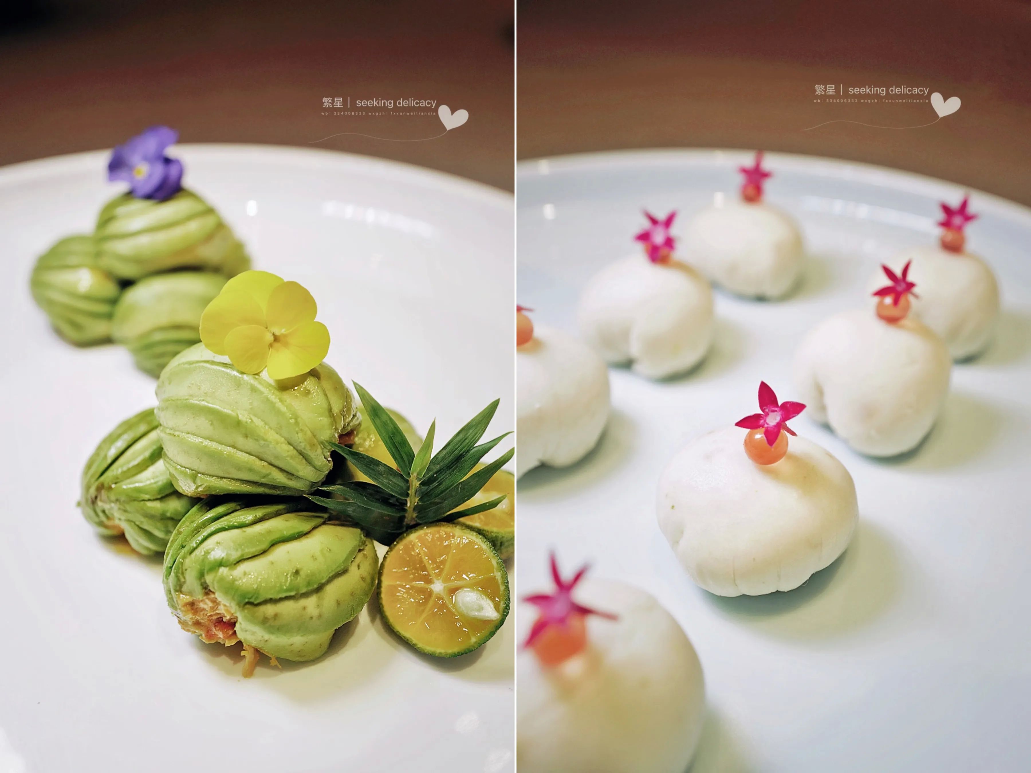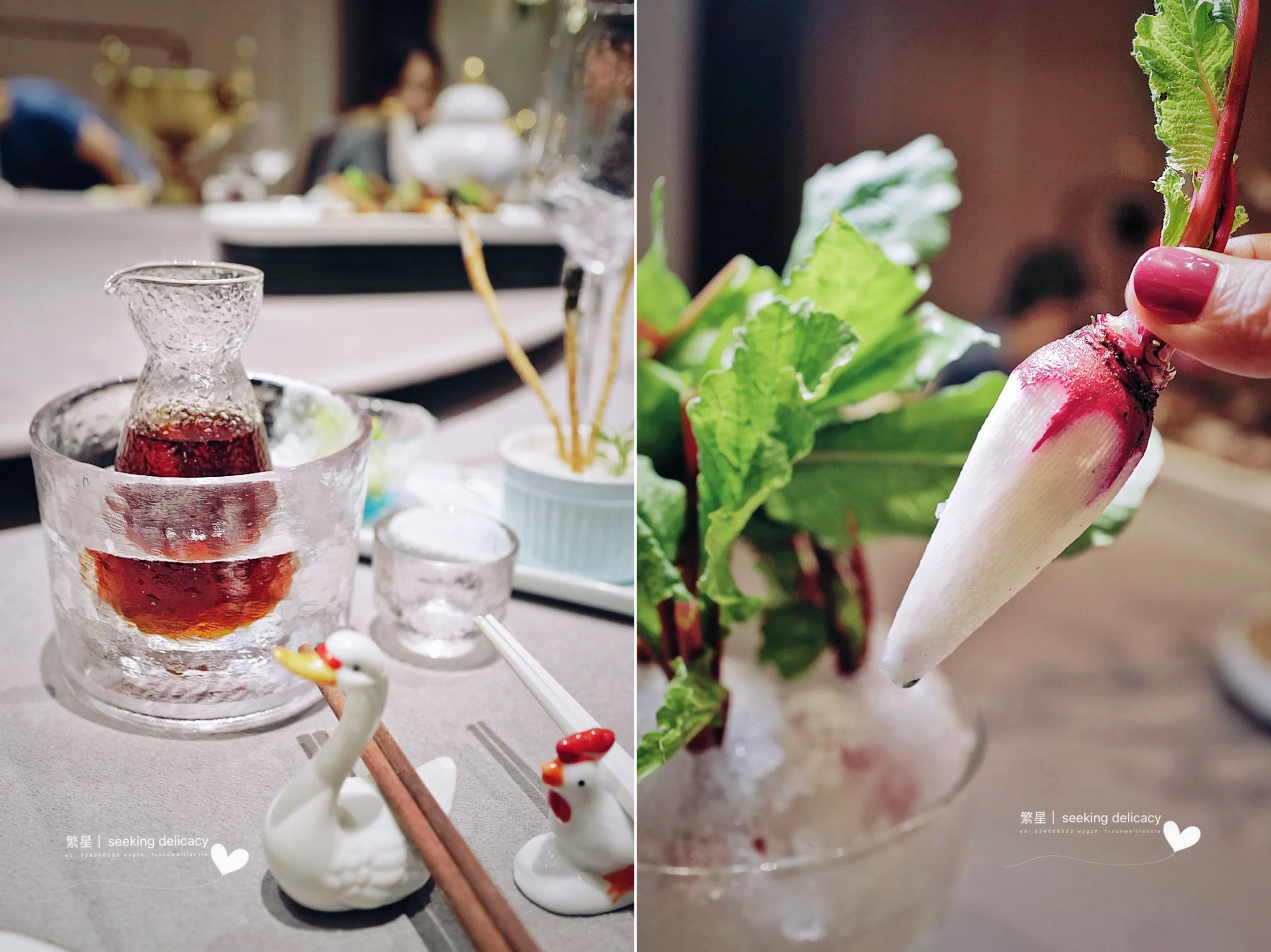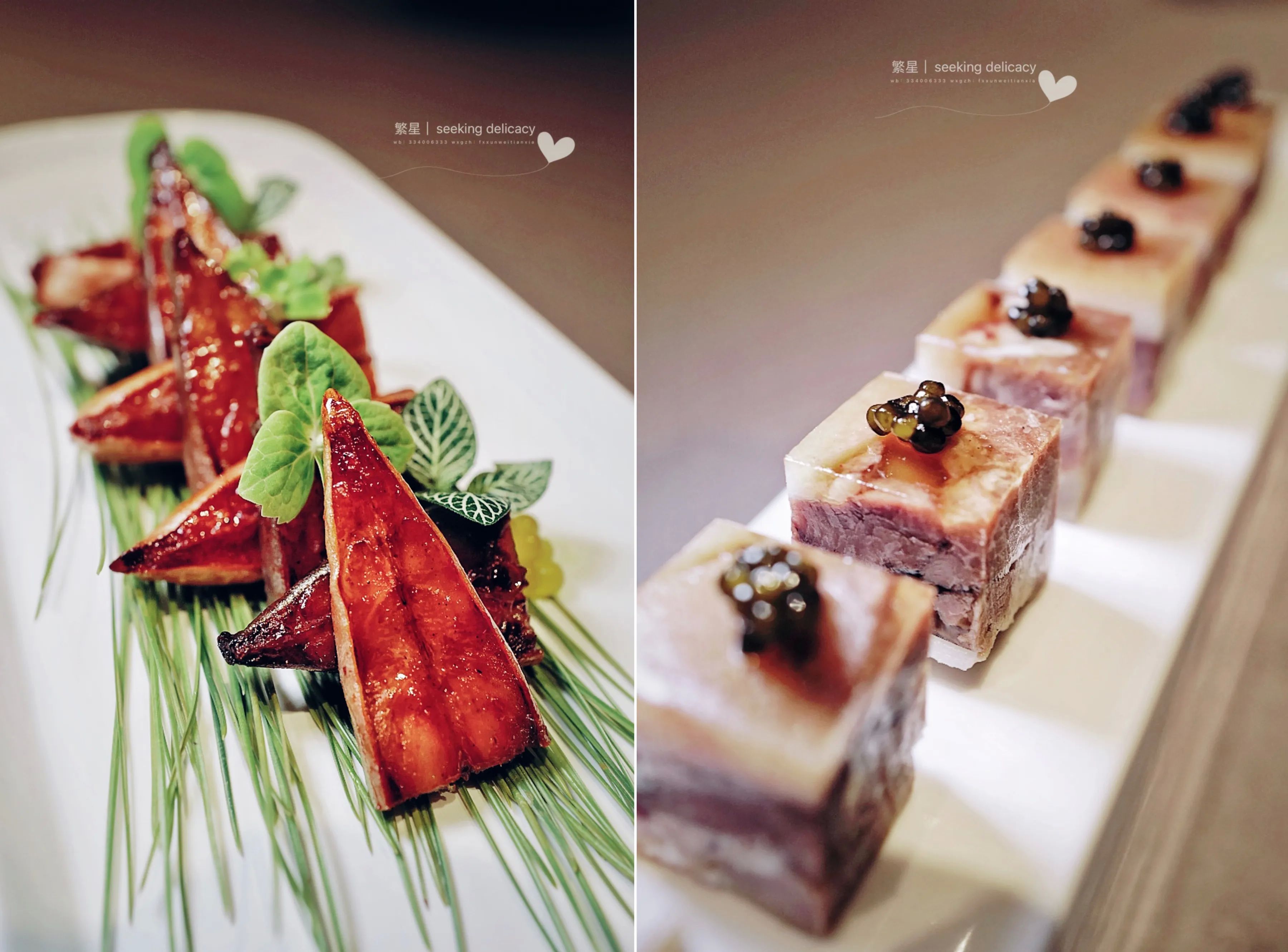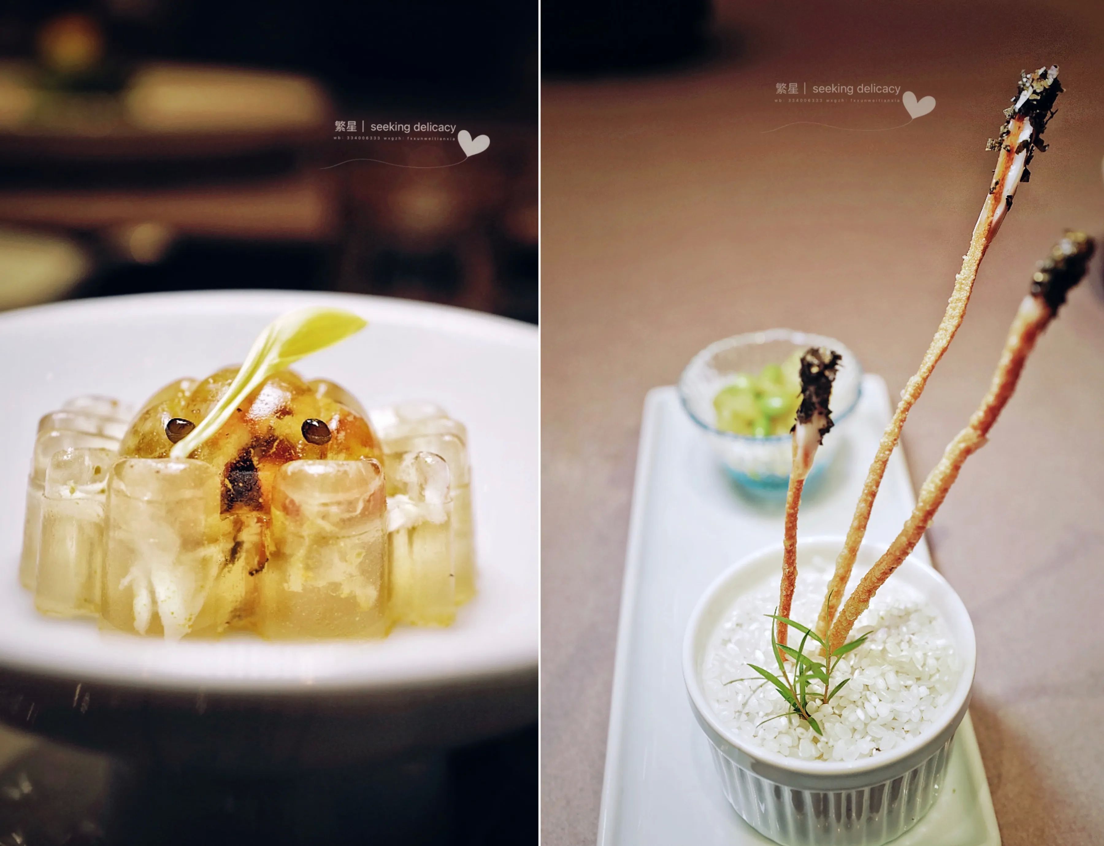 这看似的雪媚娘原来是蔓越莓包进了百合泥,这青绿的牛油果片里裹起的是蟹肉的鲜,这鱼子酱点亮的是六合猪头肉冻的晶莹,这带着叶儿的红皮萝卜原来可以直接生吃,那蟹冻竟然还真是蟹苗初长成的模样……