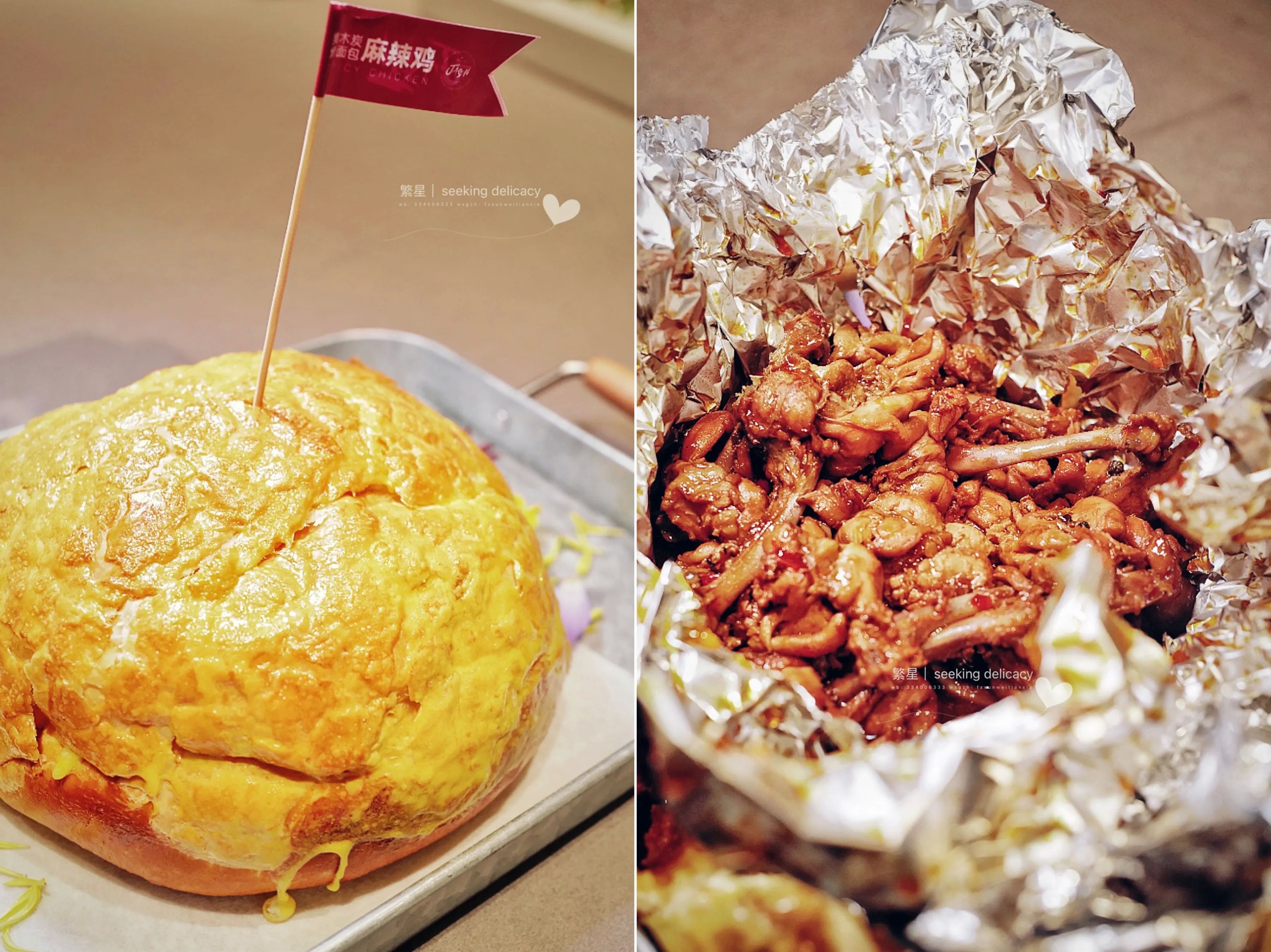 要不是插着的小旗子上写着麻辣鸡,还以为真的是烤菠萝包呢,超大的巨无霸。服务生当着大家的面开切酥皮,打开裹着的锡纸,香气随着一股热气扑面而来,酱色里的鸡,带着不算重口的麻辣,在嚼劲里越发的入味鲜香。