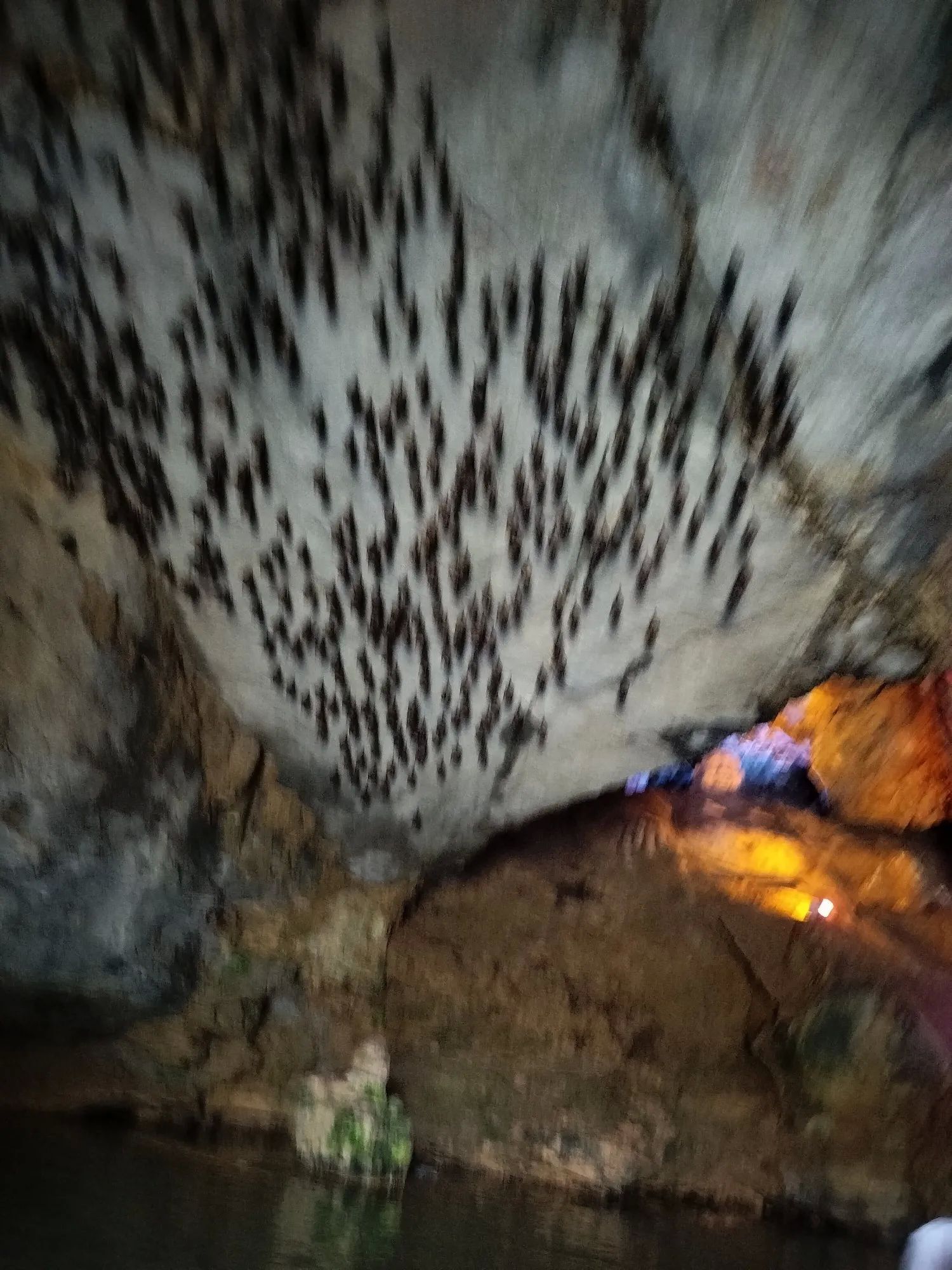 1点半开始坐船进入千佛洞,一个导游带着我们十来个人,一条船没坐满。坐在船上,穿行在岩洞中,曲径通幽,凉风习习,灯光迷离,蝙蝠挂满头,呵呵,既怕蝙蝠发疯又享受这大自然的鬼斧神工。