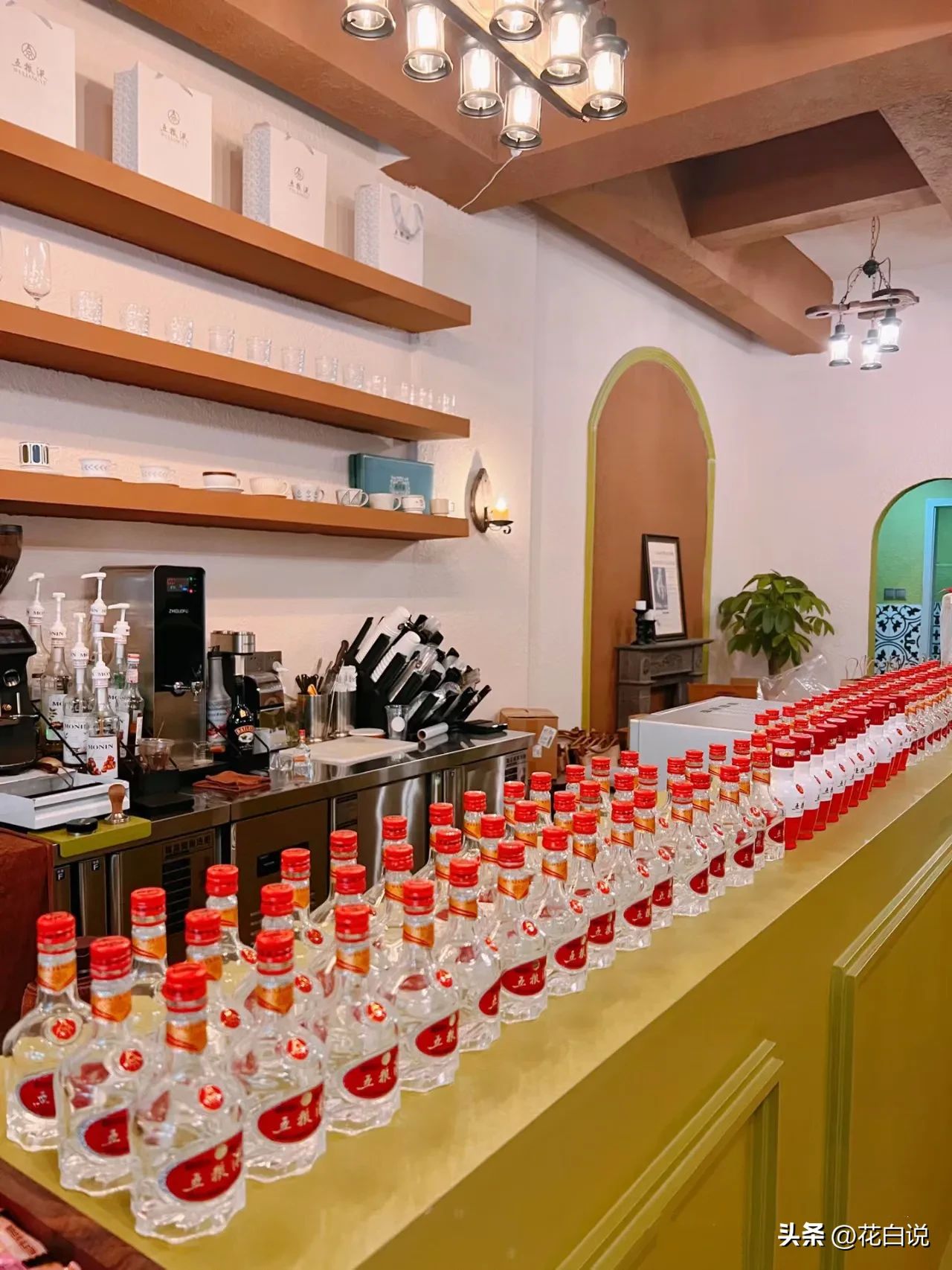 回酒店停好车,出来吃饭的时候经过一家咖啡店,看到桌面上整整齐齐的五粮液瓶子就很宜宾,在这里,没点酒量没准儿寸步难行。