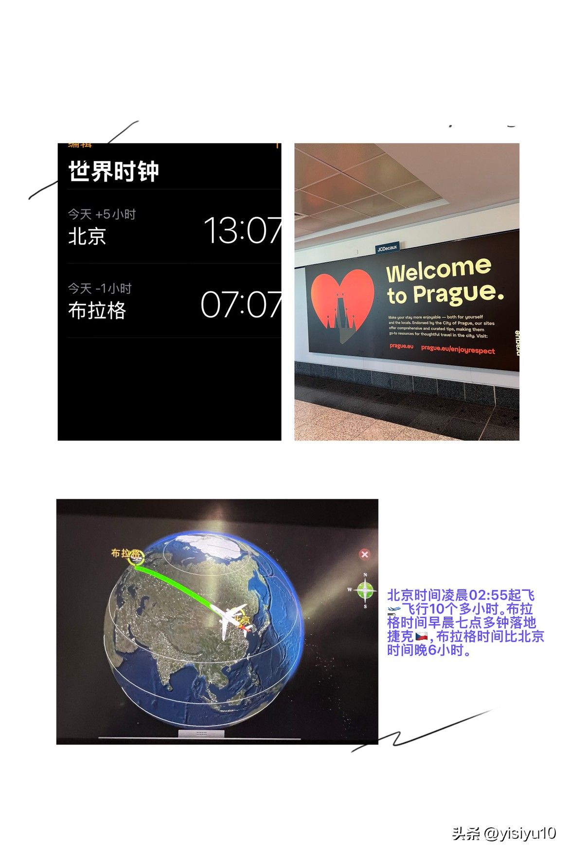 凌晨02:55从北京首都国际机场起飞,飞行了10个多小时后,于捷克时间七点多在布拉格瓦茨拉夫・哈维尔国际机场降落。布拉格时间比北京时间晚6个小时。