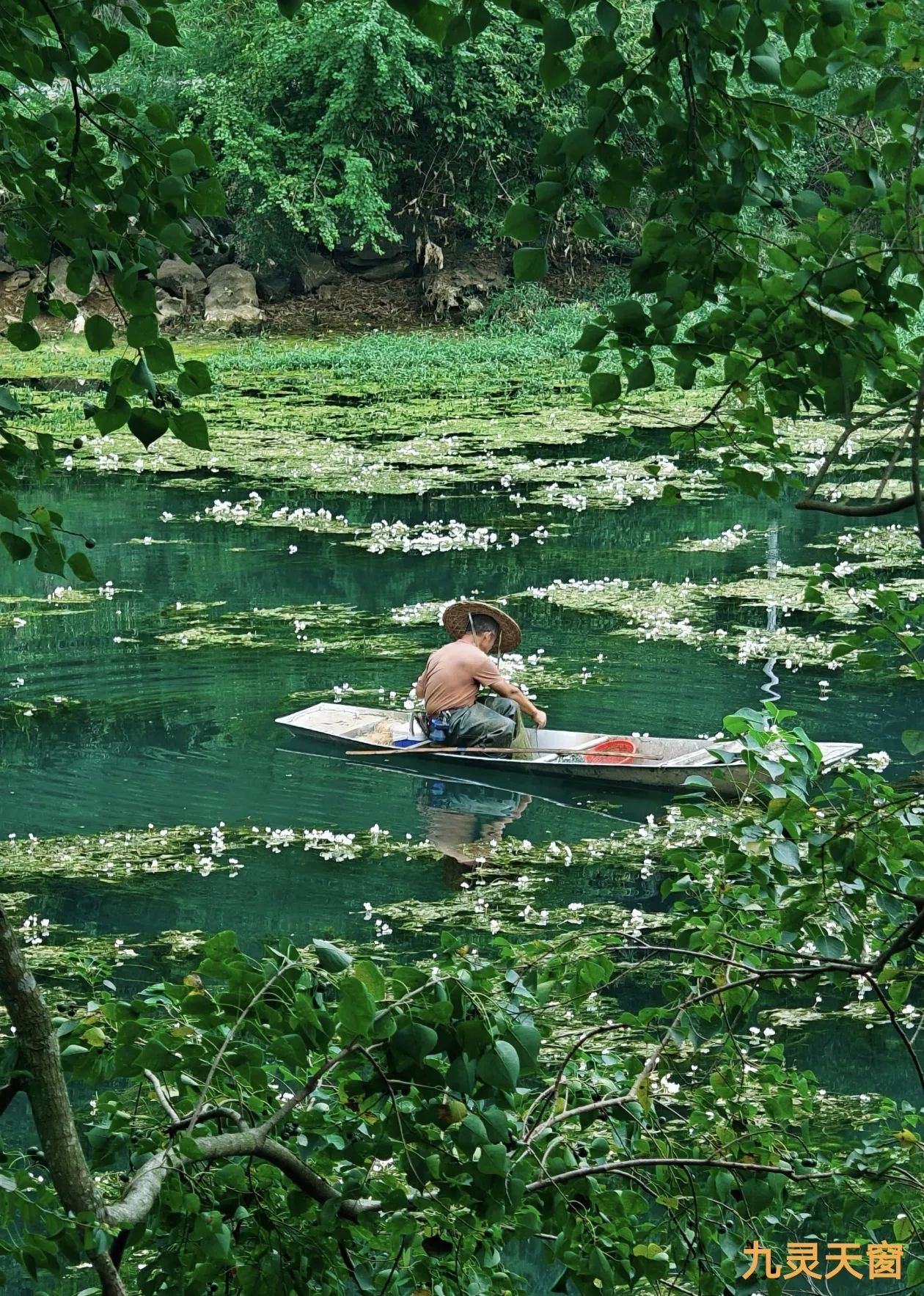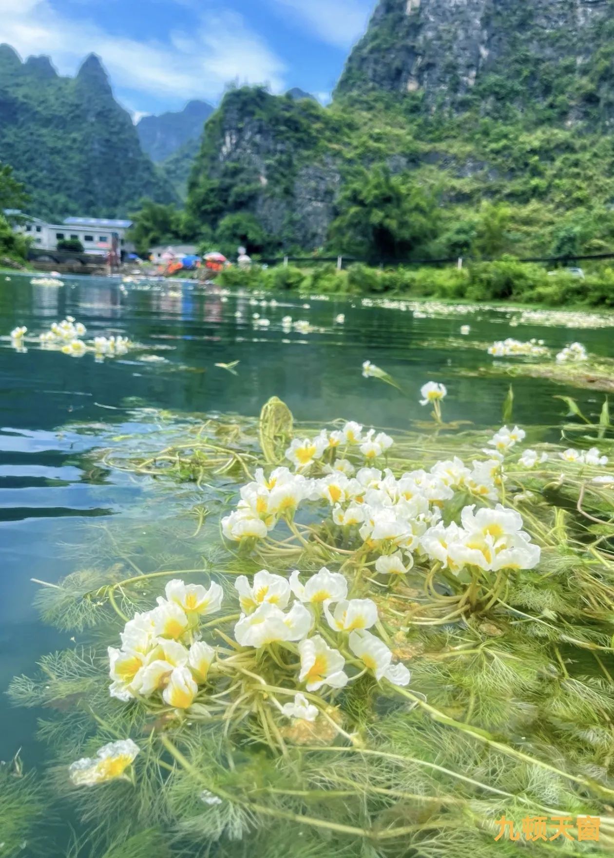 4、九灵天窗,适合露营,河水如蓝宝石,清晨是最美的,水平如镜,笼罩着一层薄雾,宛如仙境。旁边山上有观景台,丰水期海菜花数量不逊九顿天窗。