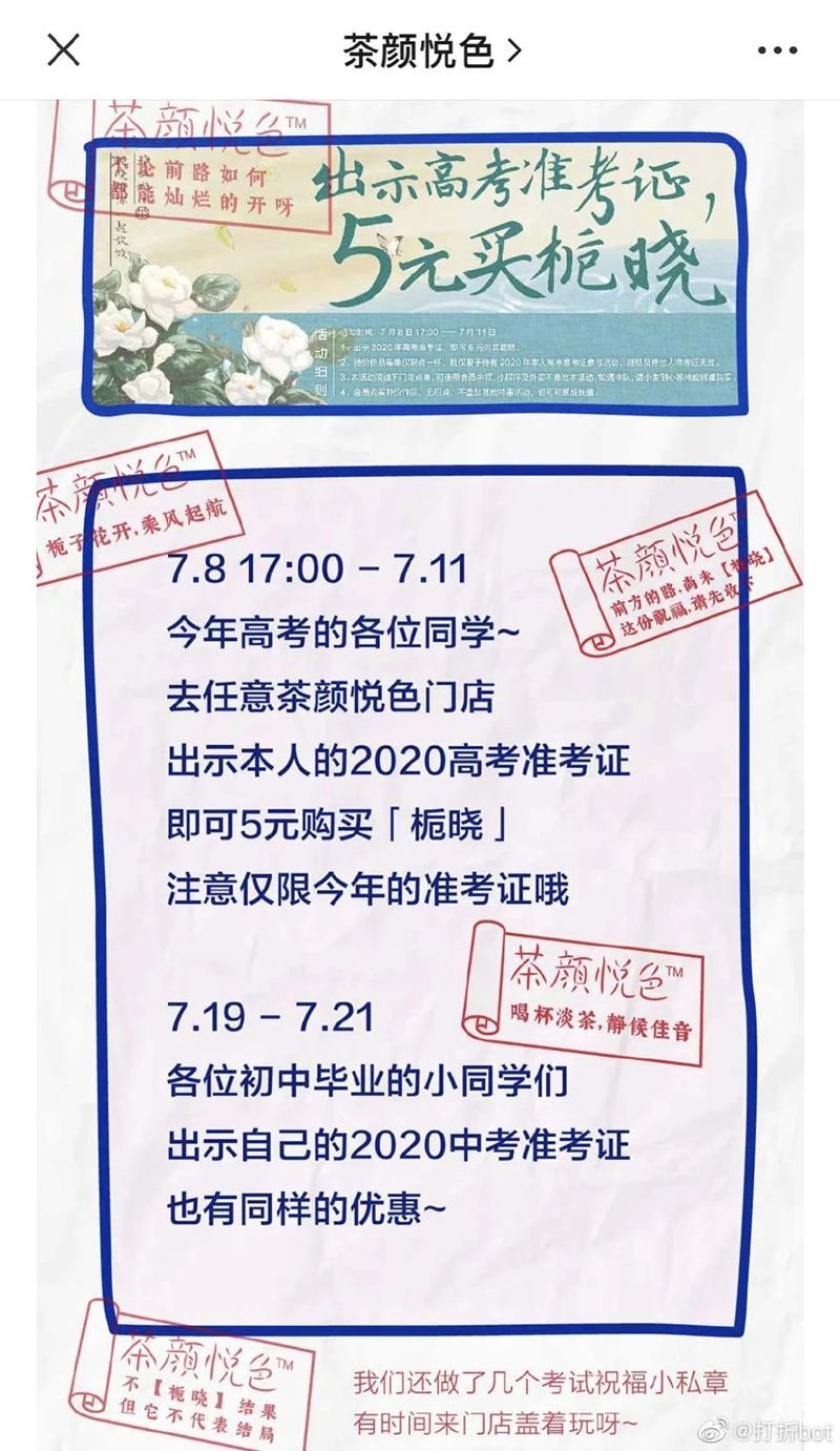 还有商家也参与了其中的活动,茶颜悦色,地点:长沙;福利:7月8日17:00至7月11日,2020年高考考生可去长沙任意茶颜悦色门店,出示本人准考证即可5元购买“栀晓”一杯。