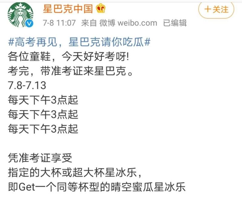 星巴克中国区域:福利:2020年7月8日至7月13日下午3点起,高考考生凭准考证享受指定的大杯或超大杯星冰乐,即Get一个同等杯型的晴空蜜瓜星冰乐。