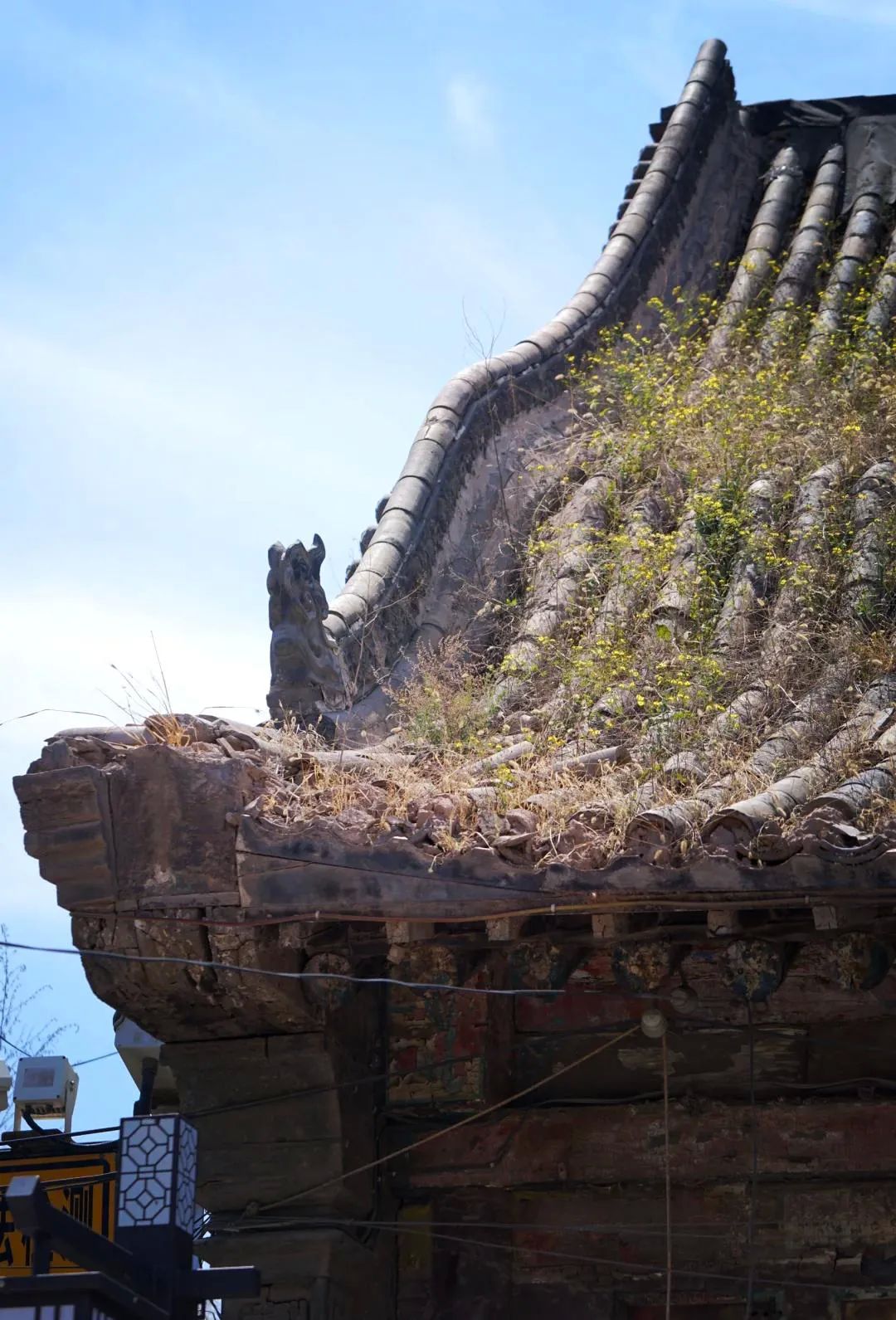 游走在匠心独运的各式古屋、古巷、古墙、古瓦之间,飞檐翘角,浮雕灰塑,精美绝伦!慨叹古代劳动人民令人钦佩的勤劳与智慧之余,心中仍有大憾,那就是祁县的昭余古城与平遥古城,许多年代久远的古建筑破旧不堪,残垣断壁,濒临丹塌的飞檐灰瓦,屋顶的青黄夹杂枯草(图五),微风中虽增添古意,但也令人生萧瑟之伤情。
