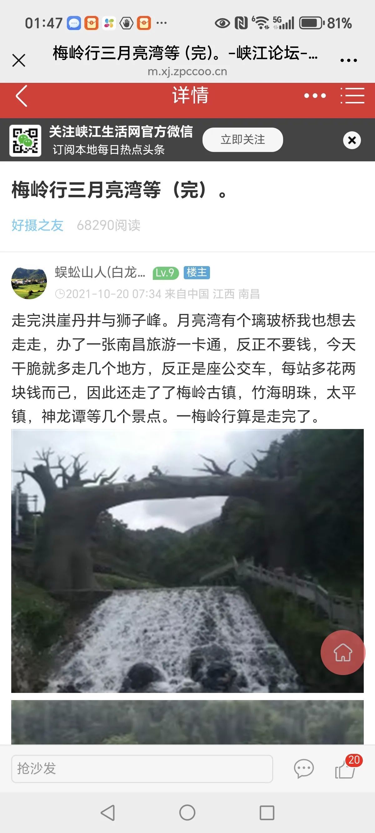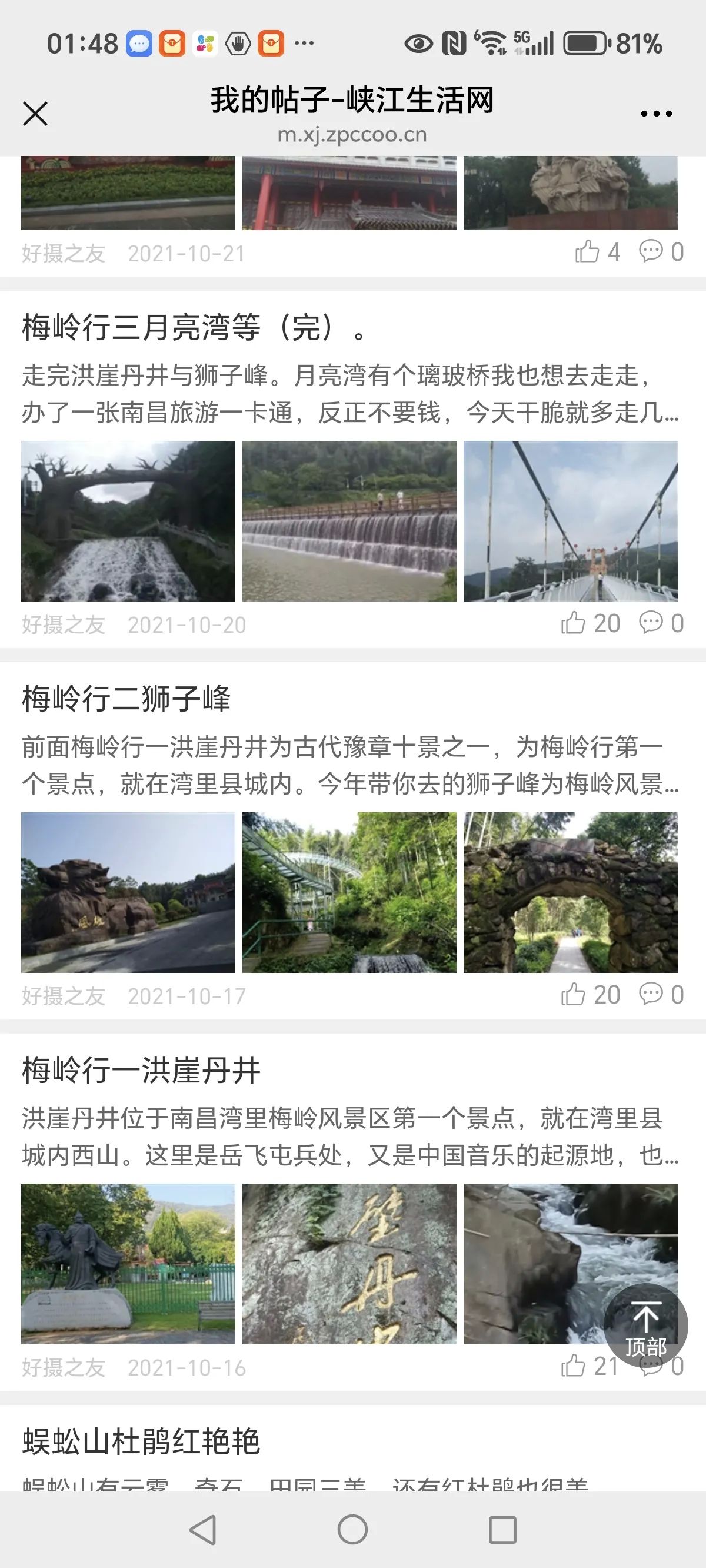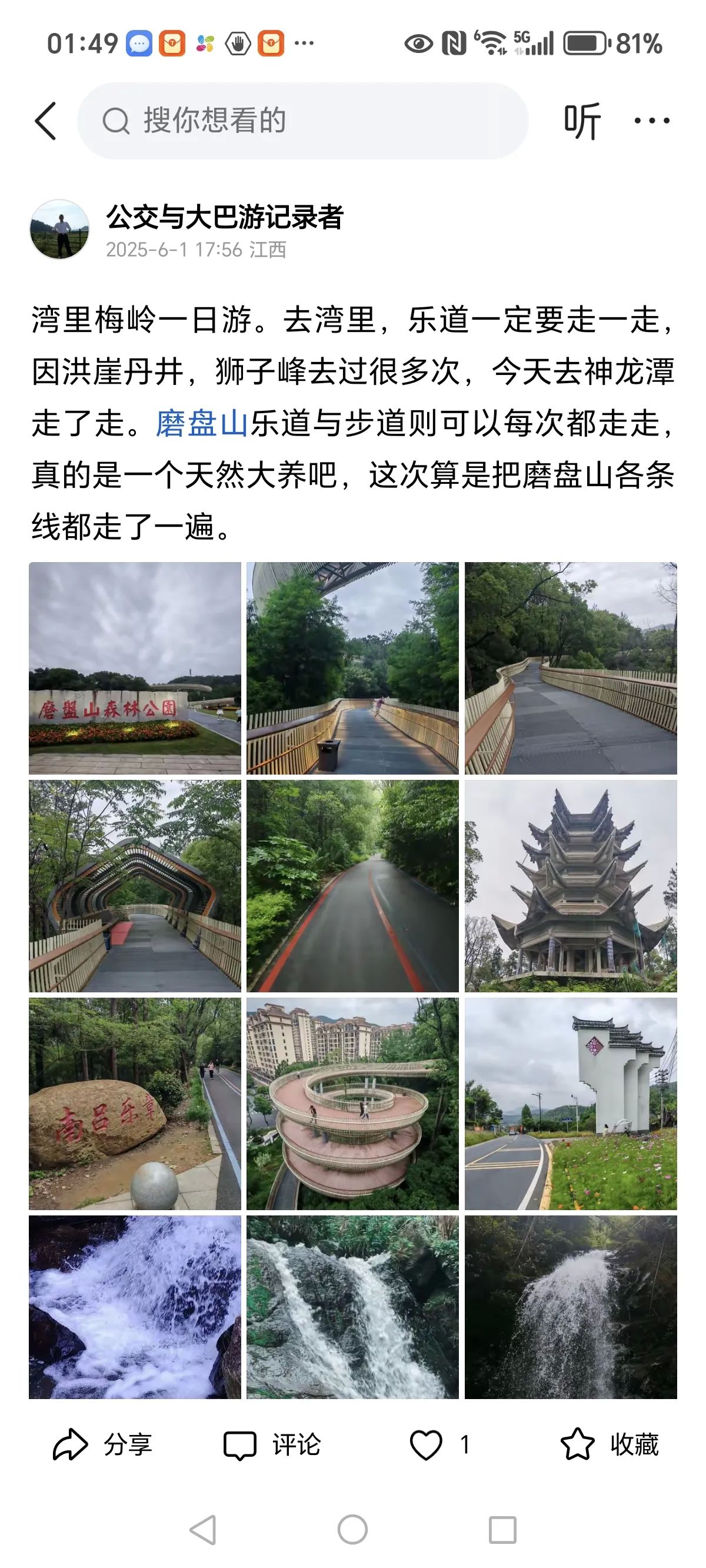 经常去的自然是湾里城区,湾里城区应该是梅岭中心点,来到这里首先是看看景秀湖,走走磨盘山乐道。然后就是去参观南昌一卡通上面的免费风景区,首先是湾里市区内的洪崖丹井,然后就是540狮子峰旅游专线,依次是,月亮湾,梅岭镇,竹海,大平里心街,狮子峰去过三四次了。从太平里心衔步行3公里是神龙潭。