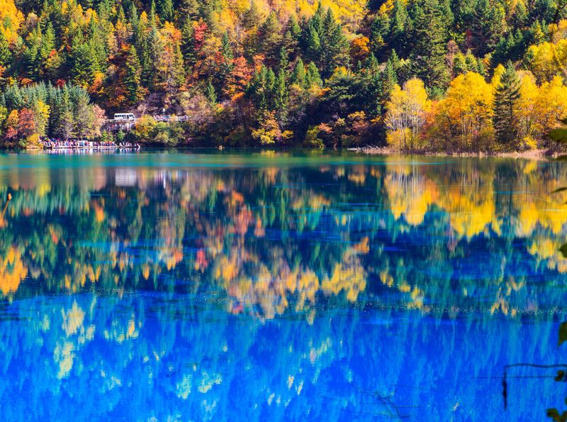 九寨沟的“精华”,湖底钙华与藻类交织出五彩斑斓的图案,秋季彩林倒映湖面,宛若仙境。