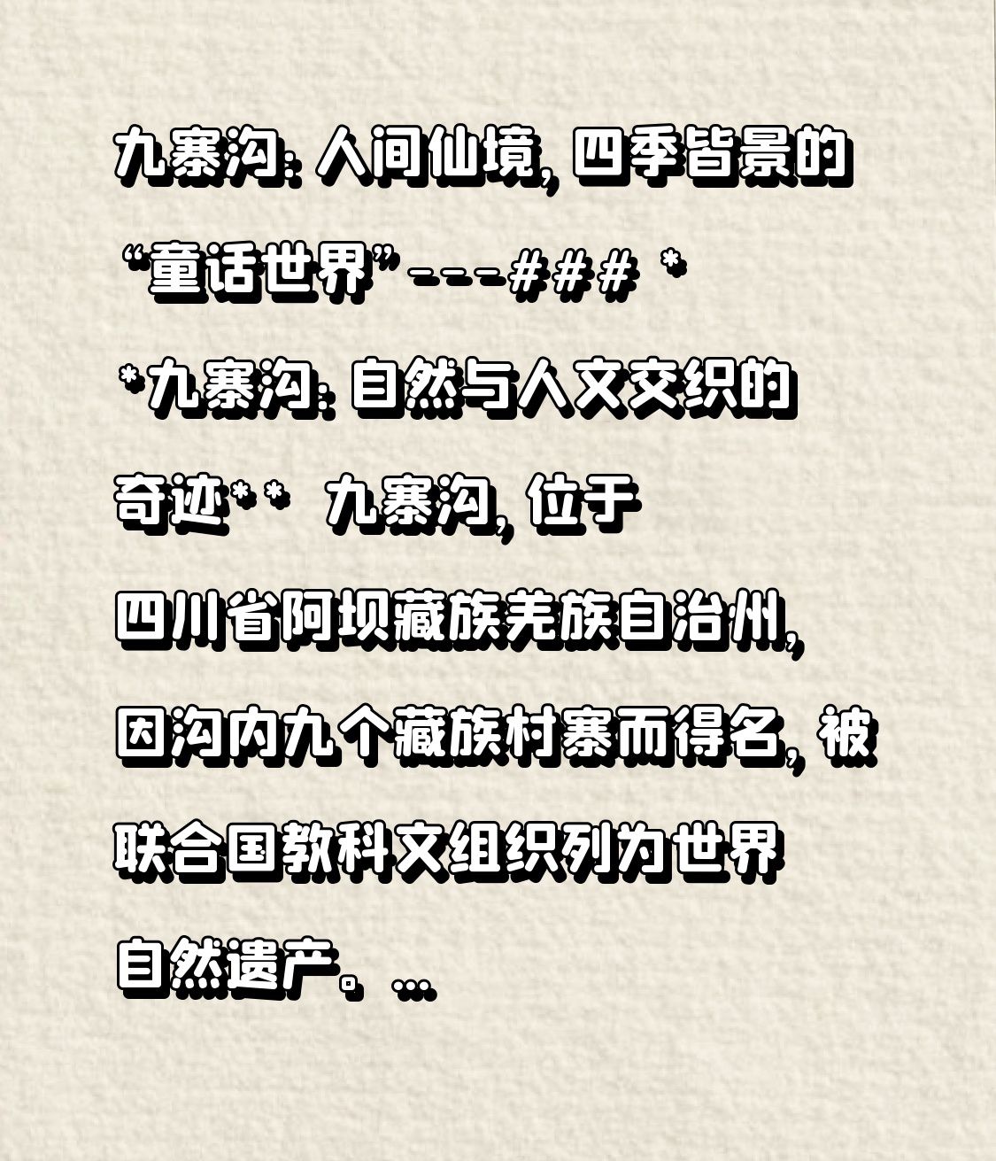 九寨沟,位于四川省阿坝藏族羌族自治州,因沟内九个藏族村寨而得名,被联合国教科文组织列为世界自然遗产。这里以“翠海、叠瀑、彩林、雪峰、藏情、蓝冰”六绝闻名于世,被誉为“中华水景之王”“童话世界”,是无数旅行者心中的终极秘境。