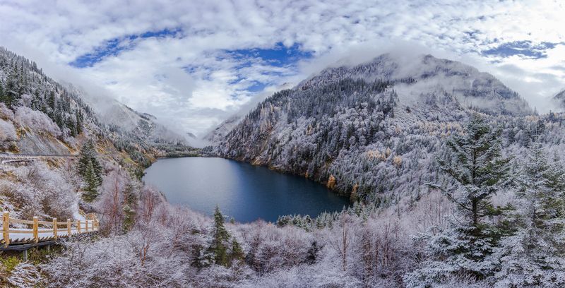 彩林与碧水共舞,金黄、火红的树叶倒映湖中,构成流动的油画。最佳观赏点:五彩池、长海、雪宝顶。