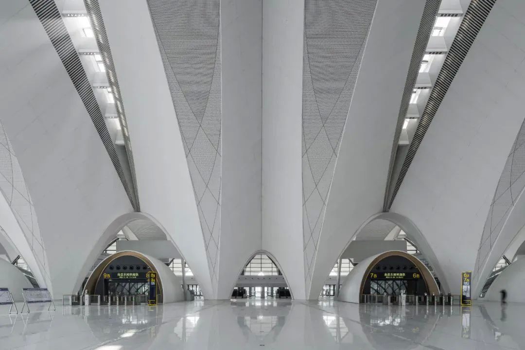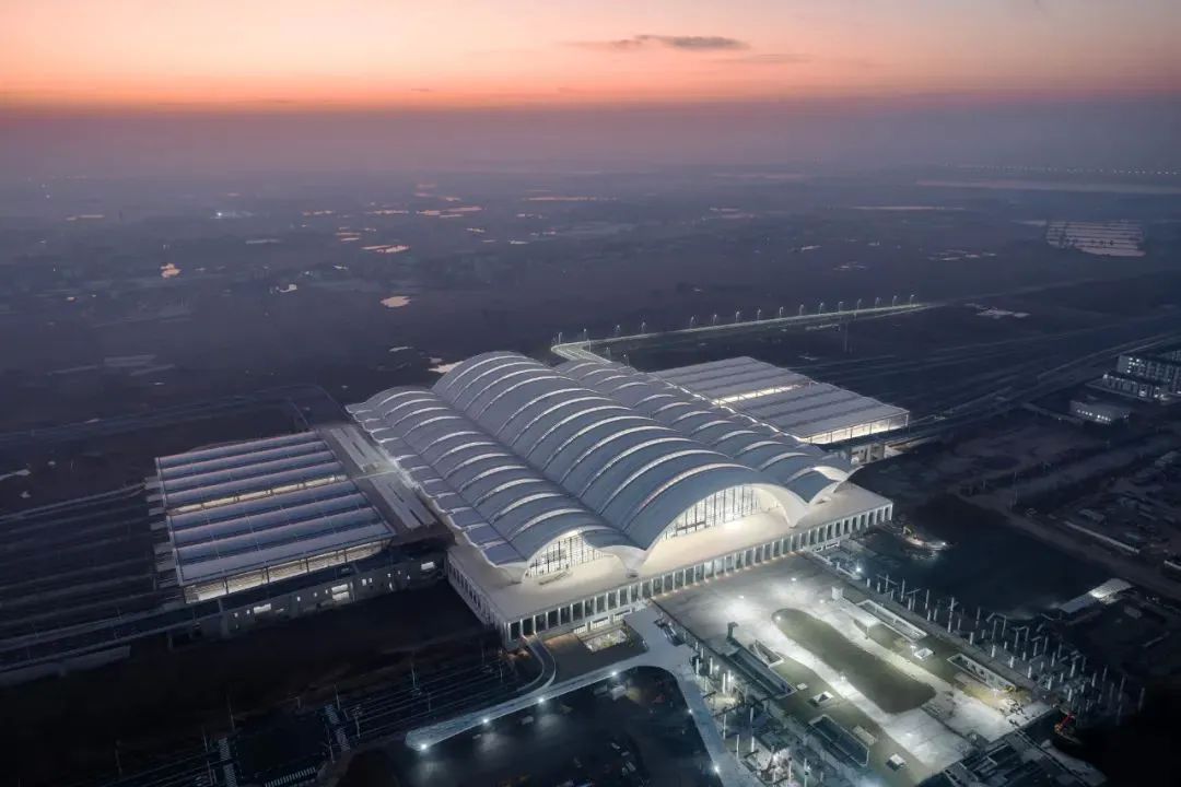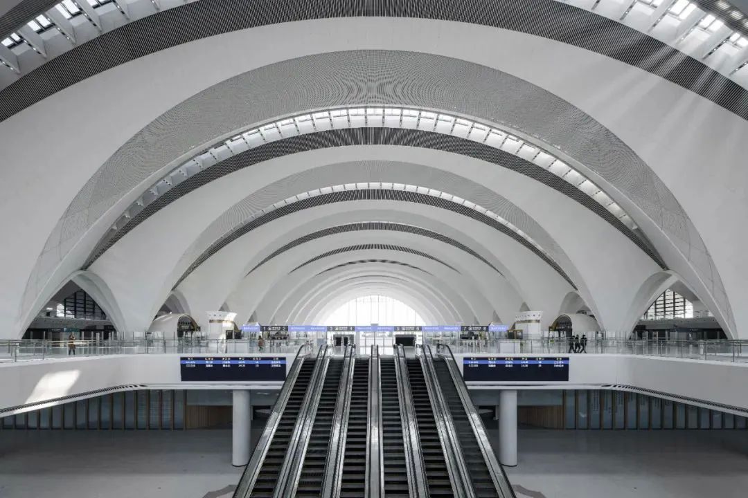 当晨曦的第一缕阳光穿透云层,照耀在南昌东站的屋面上,霞鹜齐飞的设计理念仿佛让站房在阳光下展翅翱翔,层层叠叠的屋面如同水面上泛起的涟漪,美轮美奂。您可以想象一下,站在这样一个极具现代感和动感的枢纽站中,看着高铁如风驰电掣般穿梭而过,那是一种多么震撼的体验。