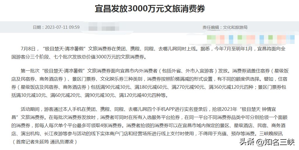 #宜昌头条#喜欢文旅的消费者福利又来了,宜昌发放3000万元文旅消费券,从现在到明年1月分三个阶段、七个批次发放。游客通过本人手机在美团、携程、同程、去哪儿网四个手机APP进行实名登录后,抢领。