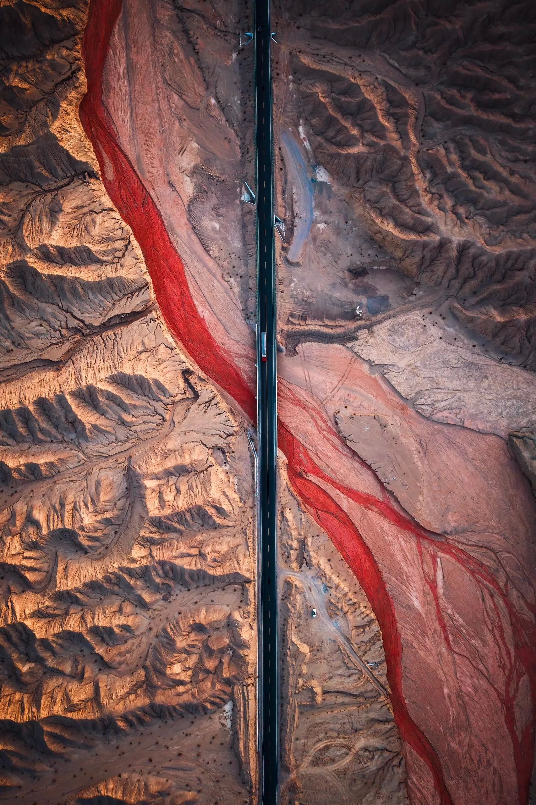 3. 大地之血:红色河床与公路交织的绝美画卷