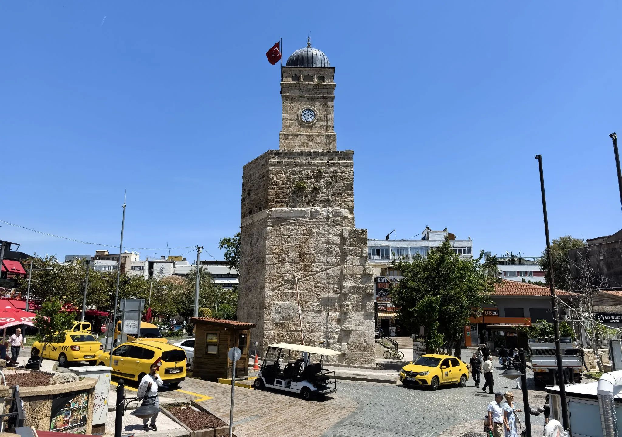 共和国广场,红色尖塔及修道院、Kale Kapisi(城堡大门)、古老的石头钟塔(saatkalesi)、一座阿塔罗斯二世的雕像(这座城市的创建者)。