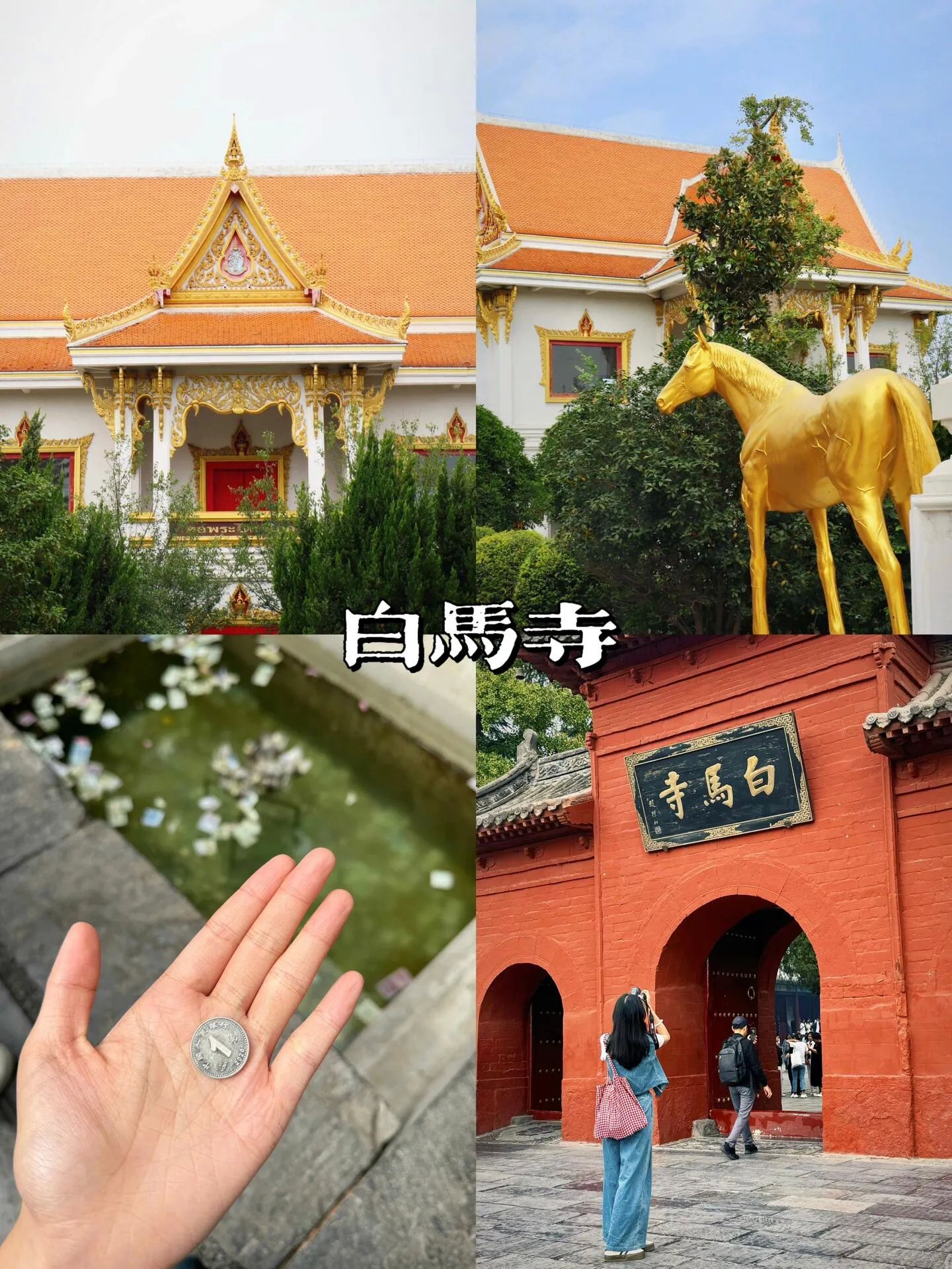 白马寺:位置有点偏,可去可不去。本来没在行程里,结果龙门石窟检修闭园,就多留一天来了这里。坐地铁到杨湾站,再打车就能到。这座寺庙超适合女儿国王风格的妆造!里面还有个止语茶舍,免费提供茶水,氛围感直接拉满!