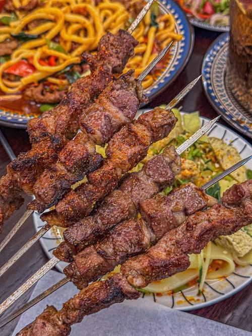 红柳烤羊肉串:以红柳枝为签子串上羊肉,羊肉块大,烤的时候红柳枝的油脂会渗入肉中,带有天然木香,外焦里嫩,南疆阿克苏阿瓦提县的做法较著名。
