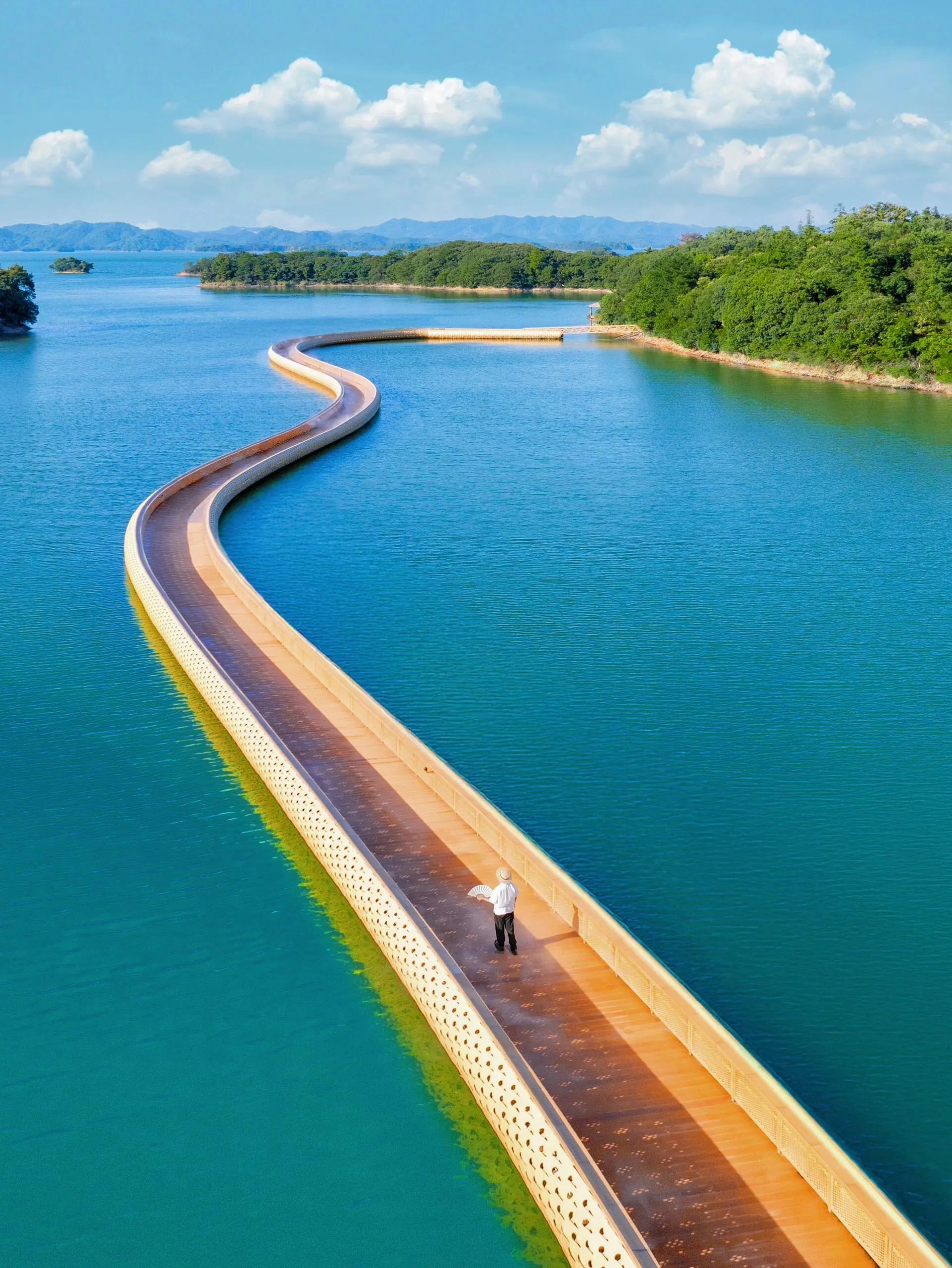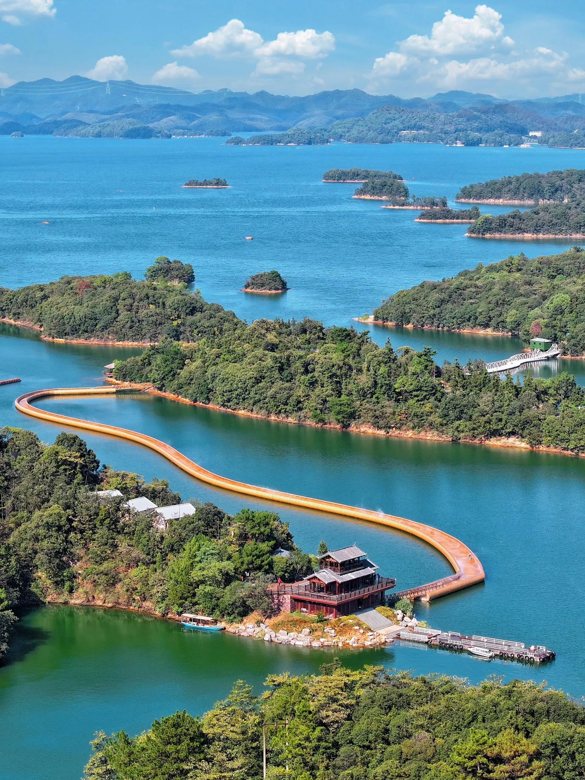水面上蜿蜒的白色长桥,航拍像条银丝带飘在翡翠湖上,随便一拍就是杂志封面感