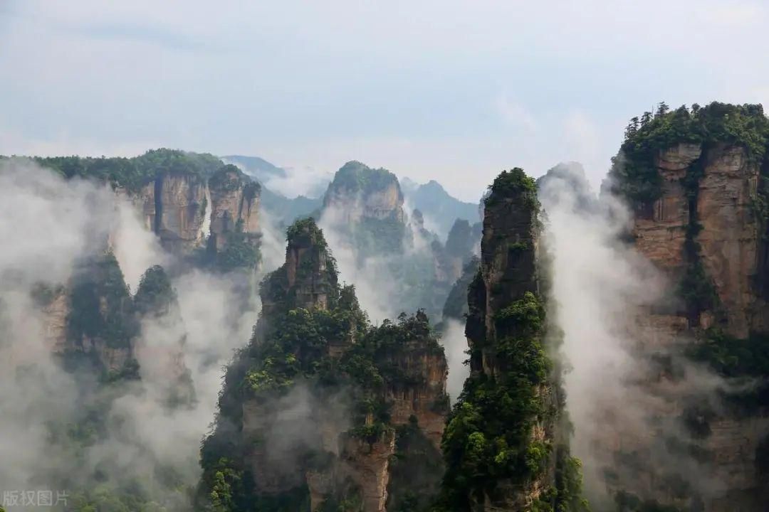 5. 张家界(湖南):《阿凡达》中悬浮山的原型取材于此,三千奇峰拔地而起,石英砂岩柱在云雾中若隐若现,玻璃栈道和百龙天梯惊险刺激。