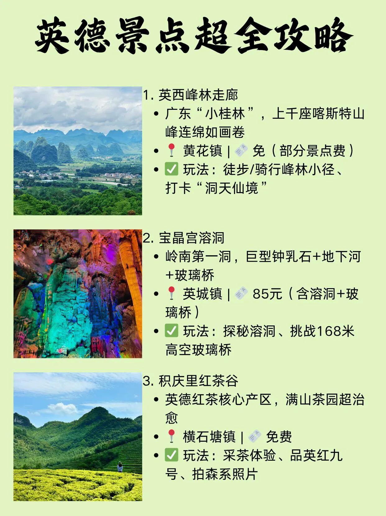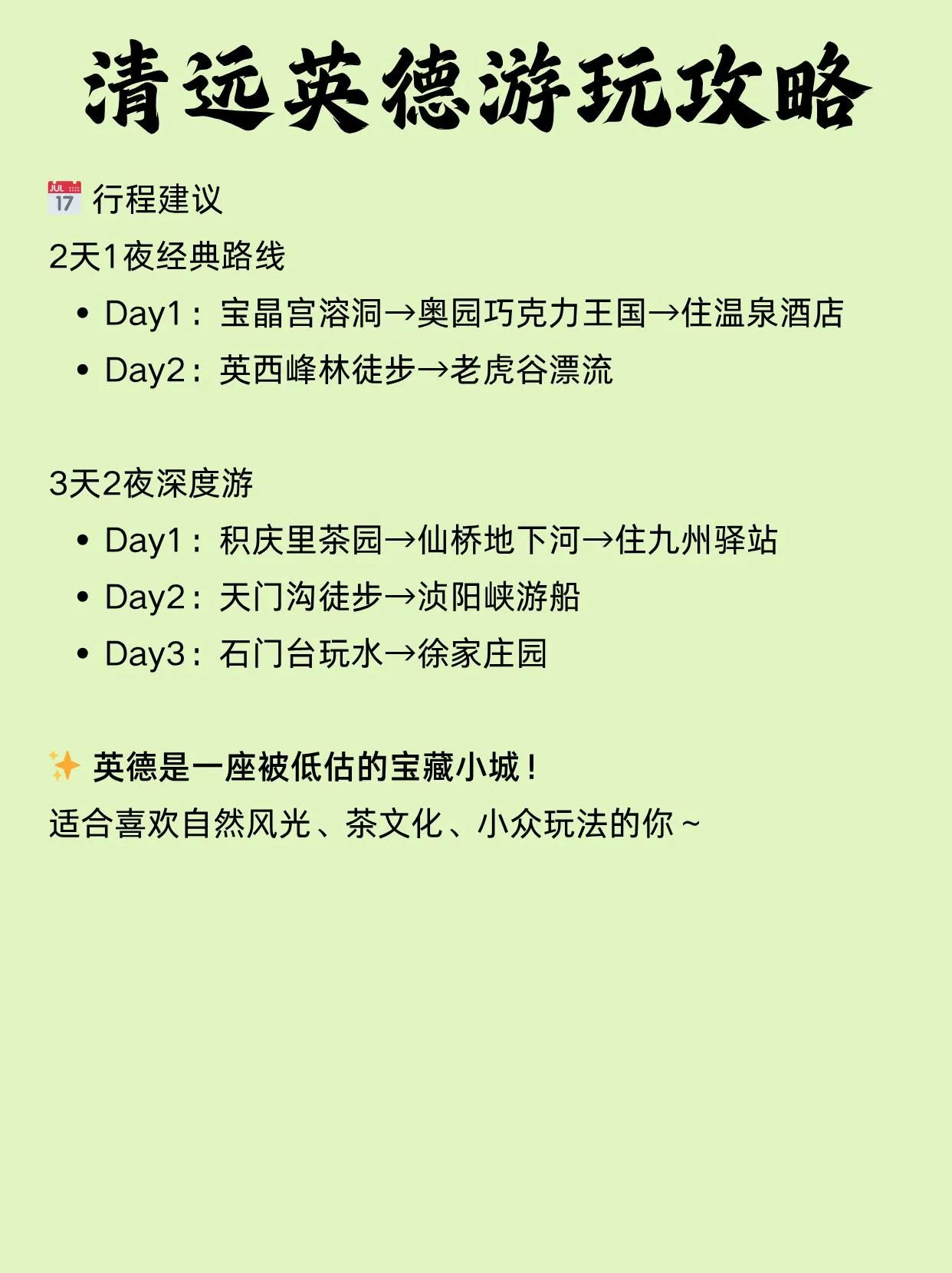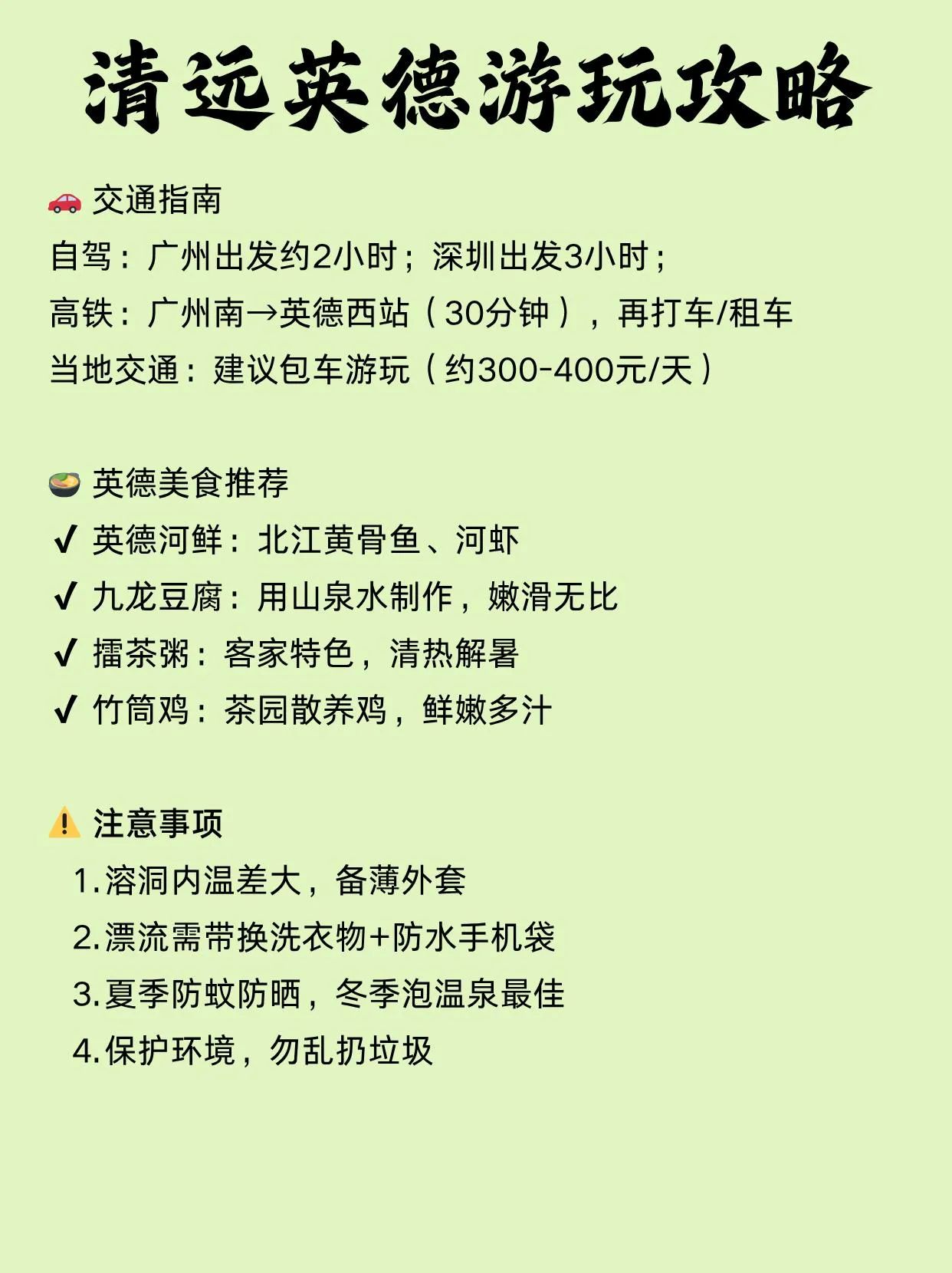 广东省旅游旺季给大家推荐值得去清远市以下是为您规划的清远三日游攻略,涵盖自然奇观、文化体验与特色美食,行程松紧有度,适合家庭、情侣或朋友出行: