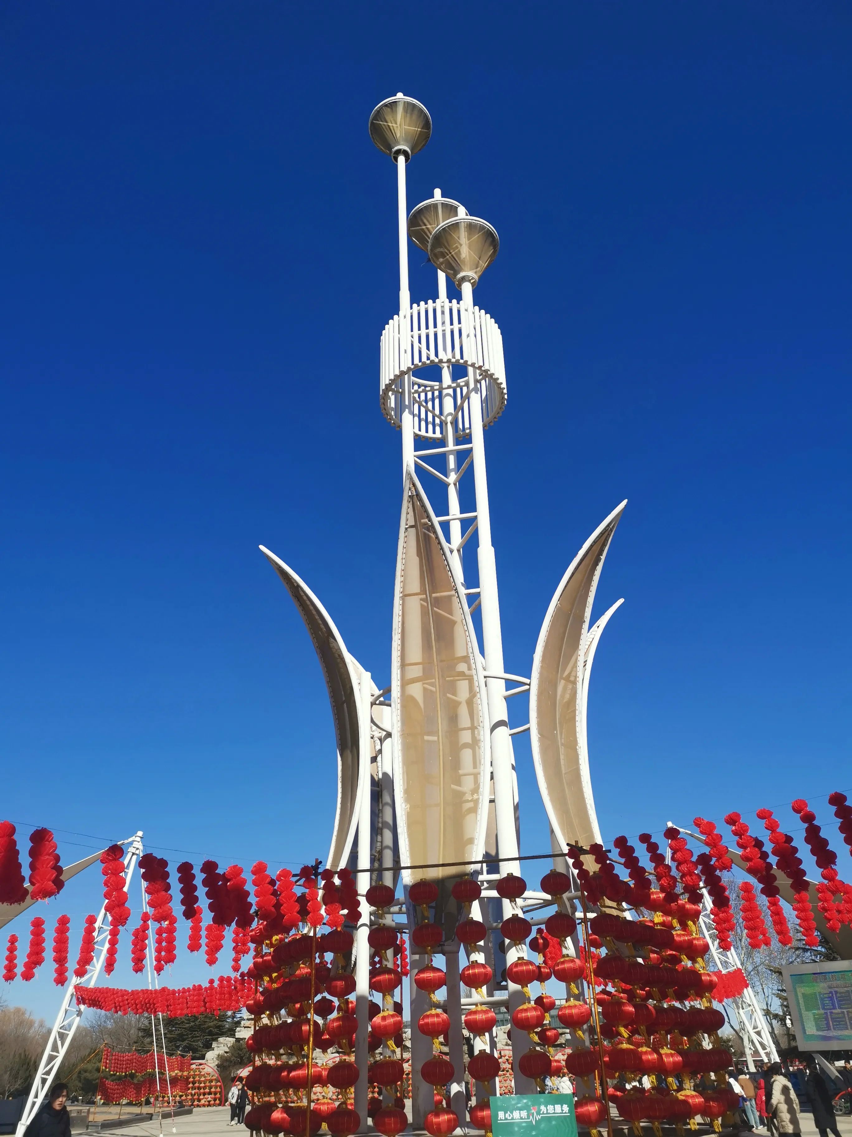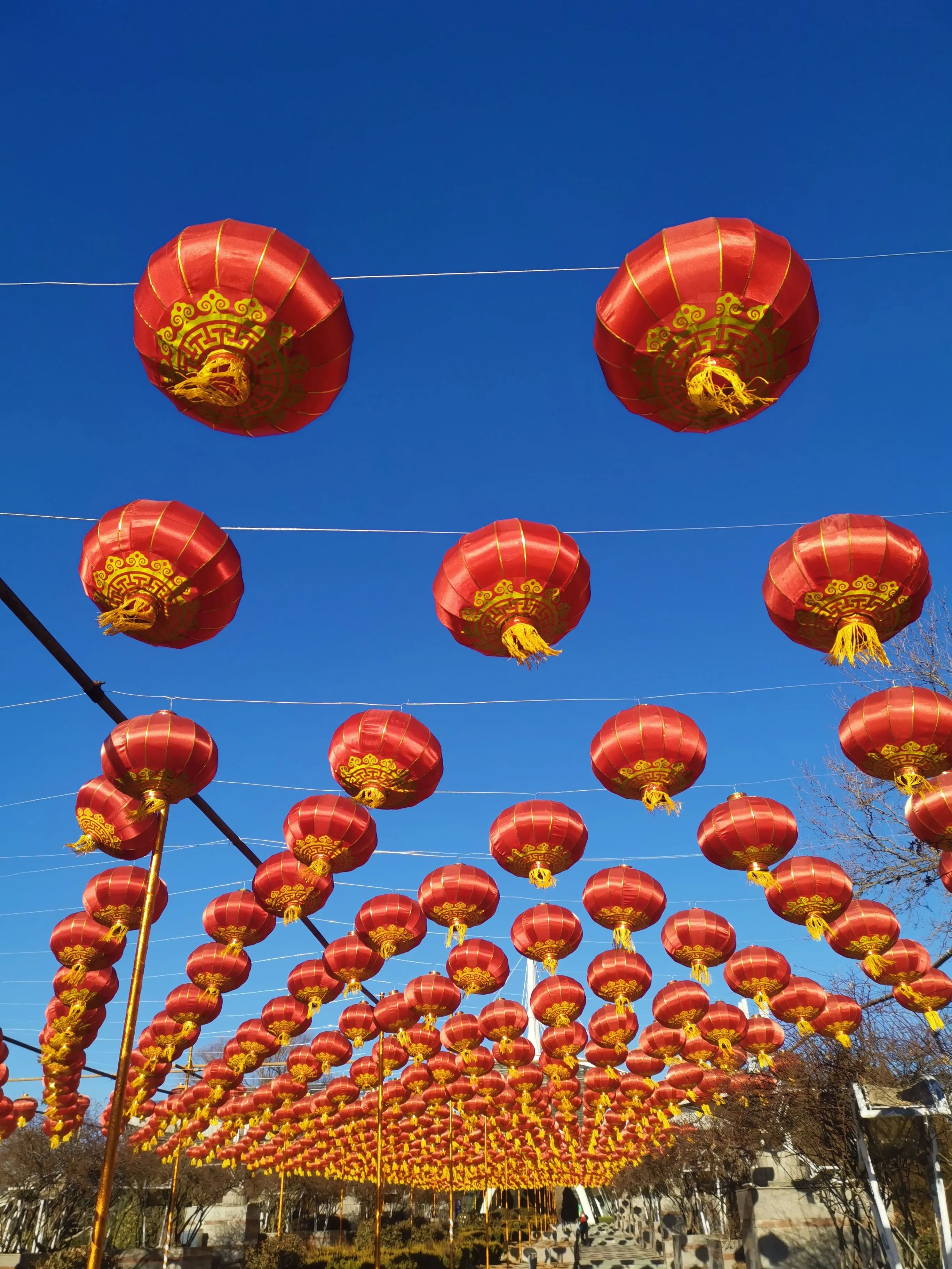 踏入园区,我仿佛一头扎进了充满年味的梦幻世界。从大门往里走,红彤彤的灯笼高悬着,一个个精致的中国结错落点缀,微风轻拂,灯笼轻轻摇曳,中国结的穗子也随风舞动,到处都是喜庆祥和的模样 。头顶是湛蓝的天空,阳光透过枝叶的缝隙,洒下斑驳的光影,一切都显得那么美好。