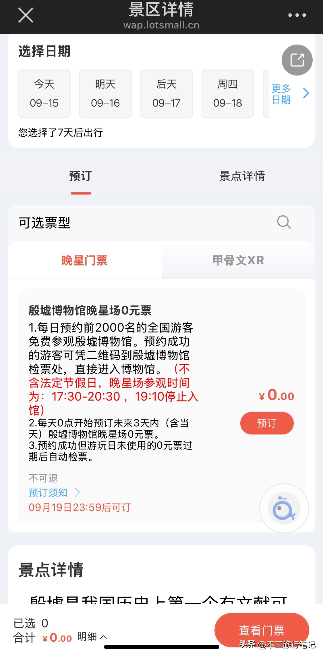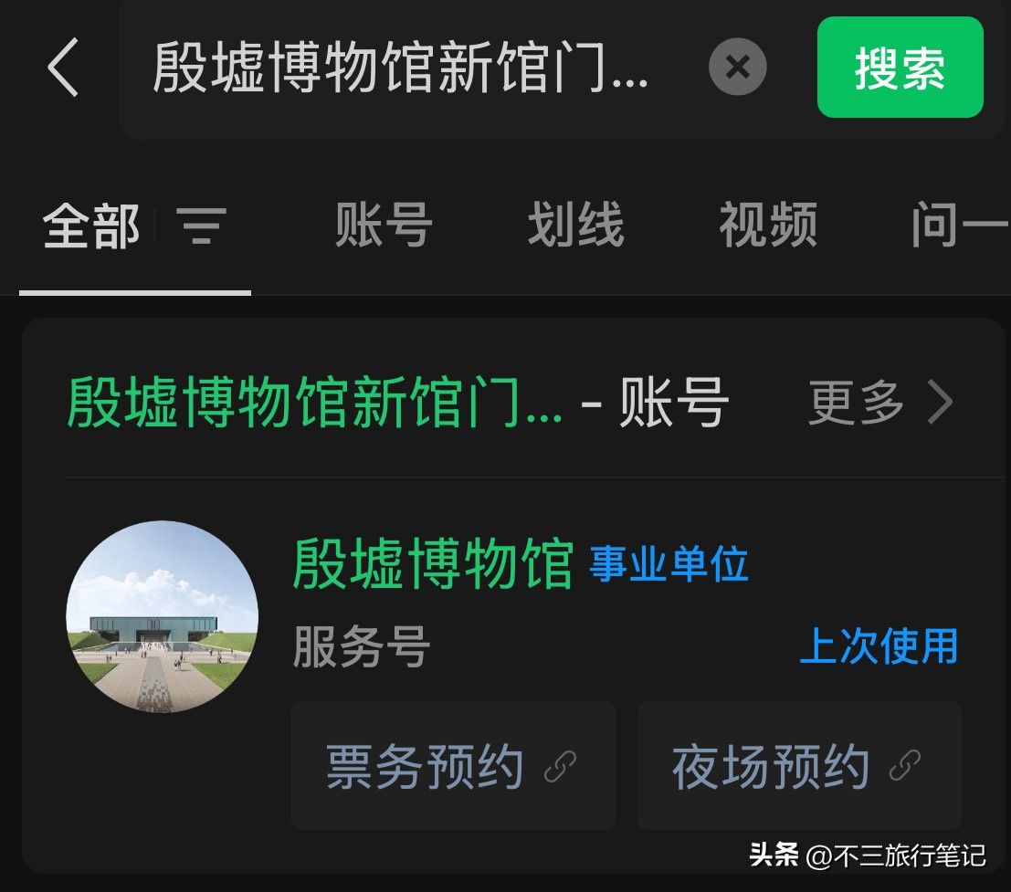 殷墟夜场,不像网上说的需凌晨抢免费票。可以提前预约,而且比较容易。微信搜公众号,点击“夜场预约”。(图16)进入图17,似乎可以提前好几天。我是提前一天预约的。殷墟博物馆很不错,条理清晰,夜场逛一定要抓紧时间。20点开始关展厅,20点30清场。我逛的不算仔细,还是有几个馆没来得及。2楼最重要,3楼“长从何来”不要错过!!!