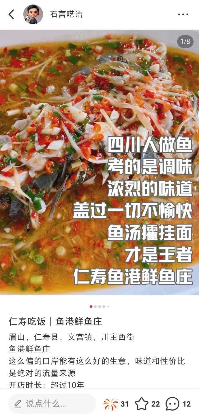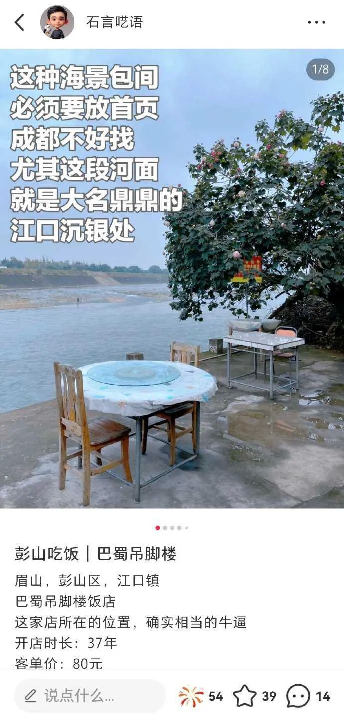 把彭山江口列在首位,是因为它是张献忠沉银古战场遗址。这里饭店的菜品,鱼是最值得一试的,独特的江鲜风味,别处难寻。而且这里的地理位置绝佳,不仅能在河边探寻铜钱,找寻古战场的遗迹,还能一边品尝美食,一边眺望岷江,遥想几百年前那场惊心动魄、杀声震天的沉银之战,历史的厚重感扑面而来。