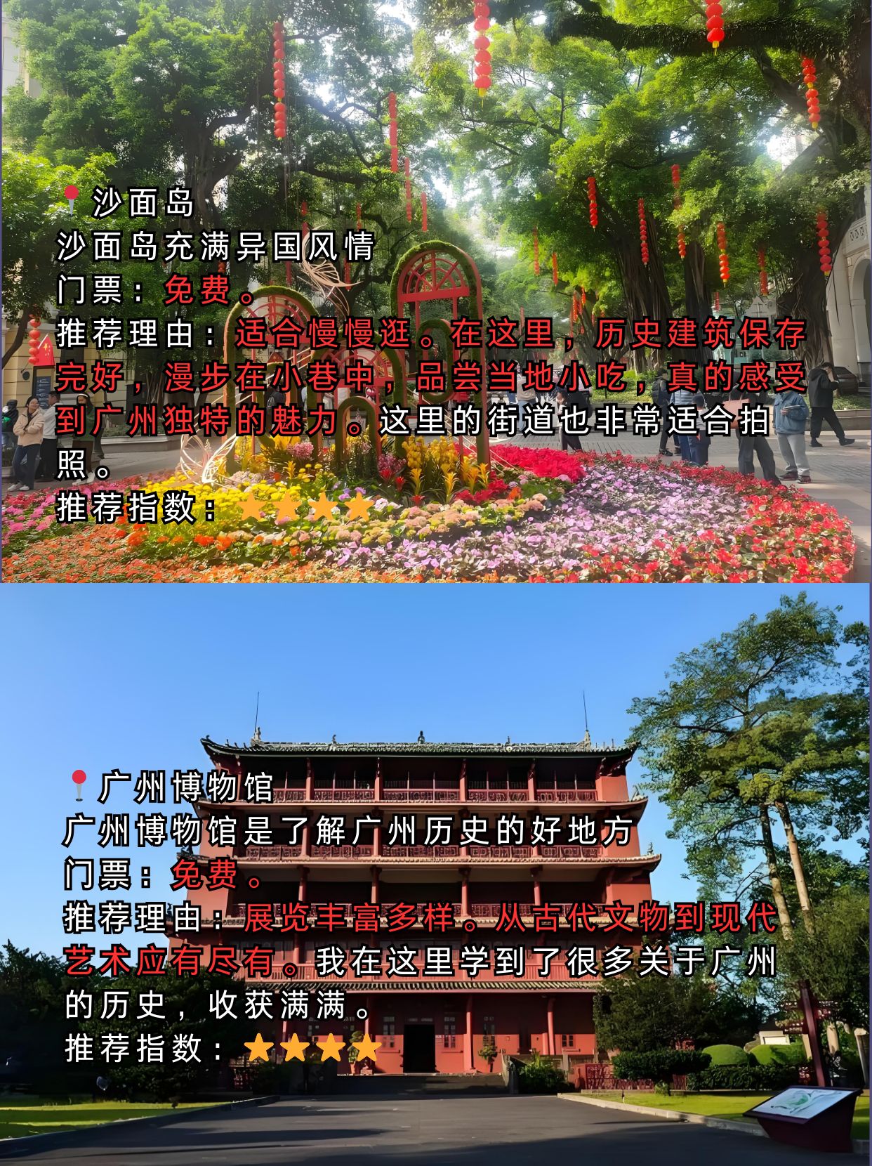 上午:抵达广州后,第一站前往沙面岛,这里保留着150多座欧陆风情建筑 ,充满文艺气息,漫步其中,随手一拍都是大片,打卡沙面堂、苏联领事馆旧址很出片。从地铁6号线黄沙站E口步行5分钟即可到达。
