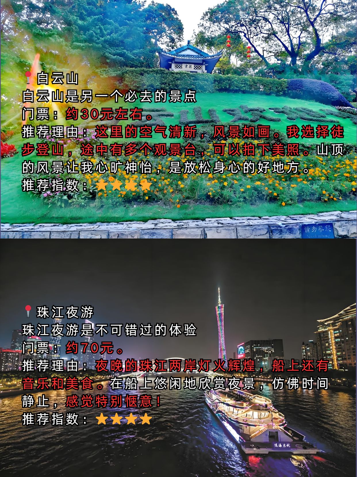 上午:前往白云山,可从南门进入,选择徒步或是乘坐缆车前往摩星岭,在山林间呼吸清新空气,登顶俯瞰广州城全貌,门票仅5元。还能体验全长1500米的白云飞索,感受风在耳边呼啸的刺激。
