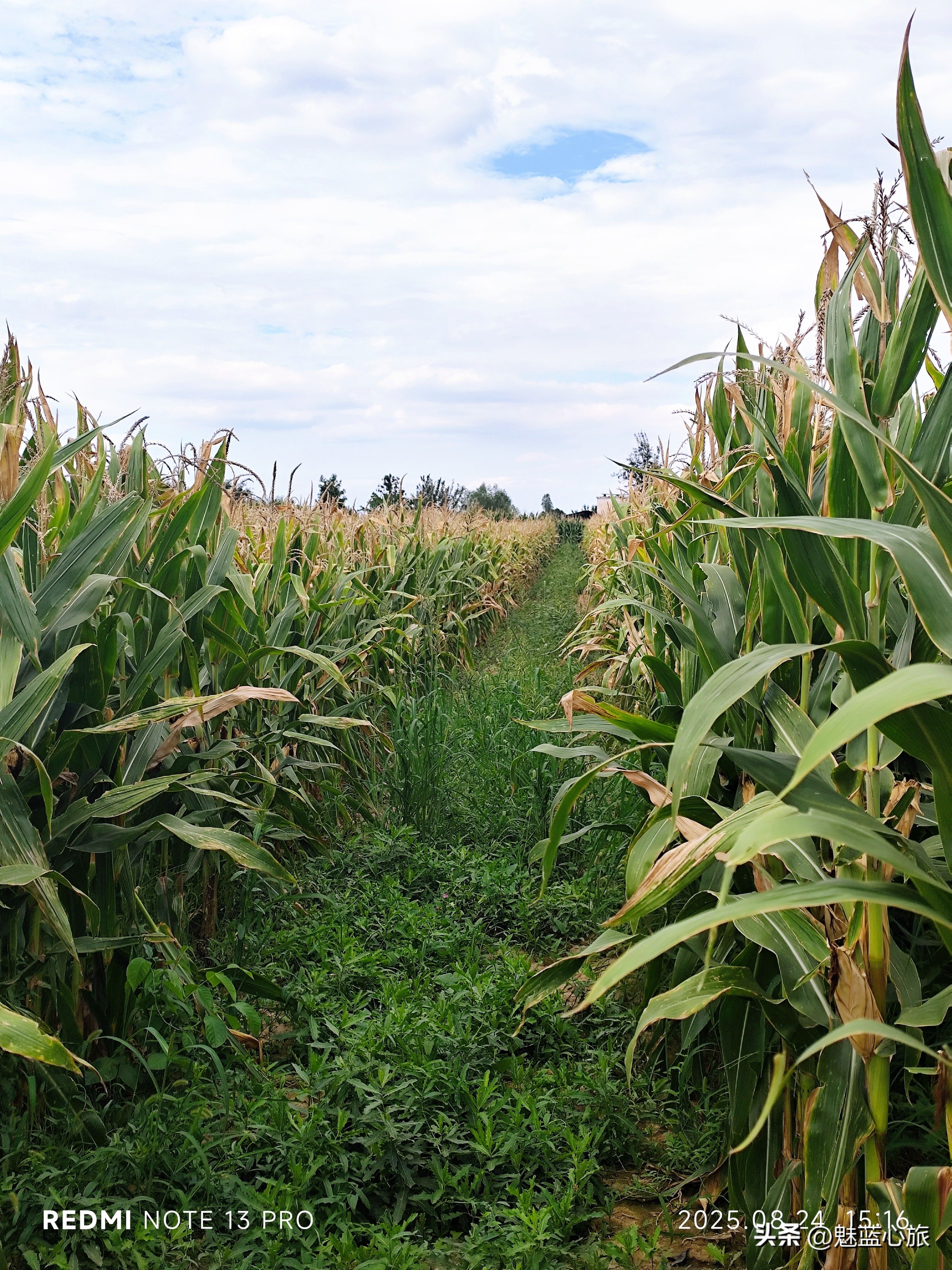 虽然还在修缮中,但我意犹未尽,看到后面有一条小路,蜿蜒而上却是一马平川,这里大片玉米地,一陇陇望不到头,让人诧异的是,玉米早就成熟却没有收,看样子也不能吃了。