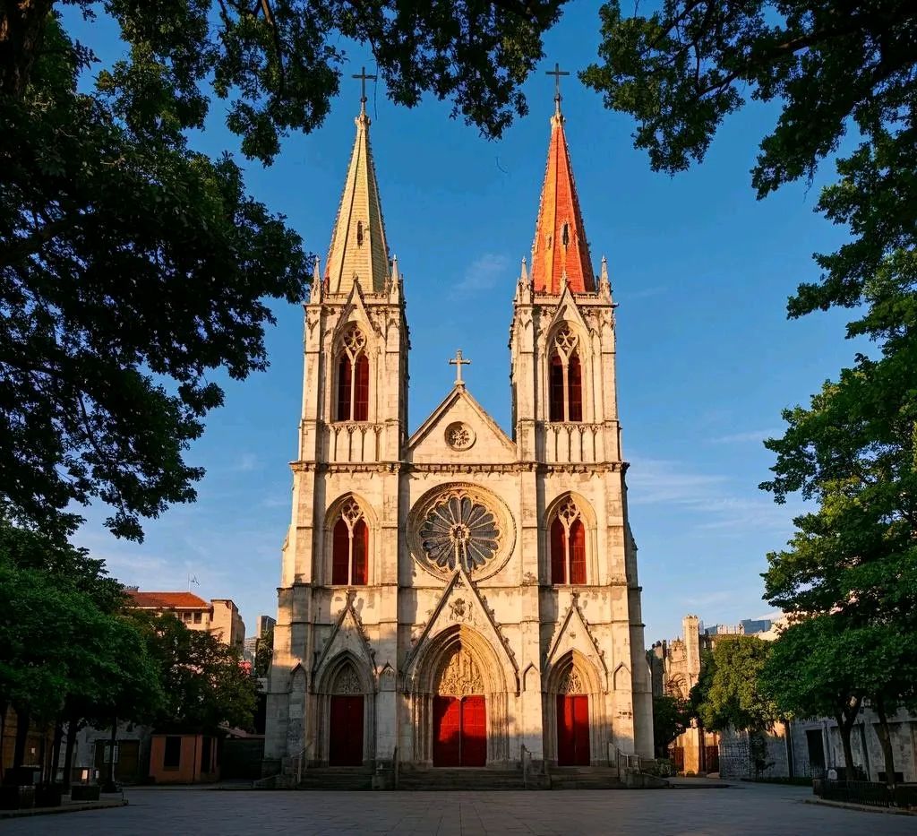 石室圣心大教堂是远东最大的哥特式教堂,其双尖塔设计和七彩琉璃窗营造出神圣而浪漫的氛围。