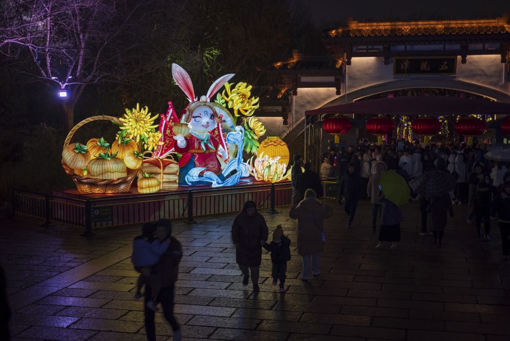 从南门踏入大明湖景区,迎面是“春溢泉城”灯组。锦鲤造型的巨灯悬于半空,鱼鳞镀金,尾翼微扬,仿佛下一秒便要跃入湖水,与倒映的星月相戏。沿湖而行,灯影如织:朱红的宫灯长廊蜿蜒如龙,孩童提着兔儿灯追逐嬉闹,老人驻足于“文瑞长廊”前,指尖轻抚灯屏上的《鹊华秋色图》,叹一句“这才是咱济南的魂”。