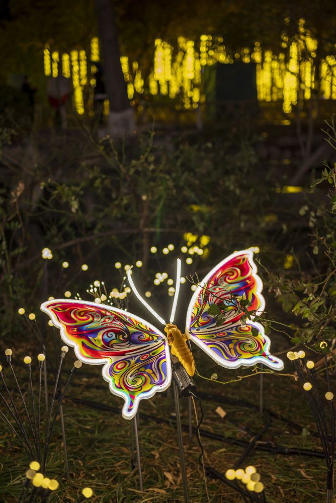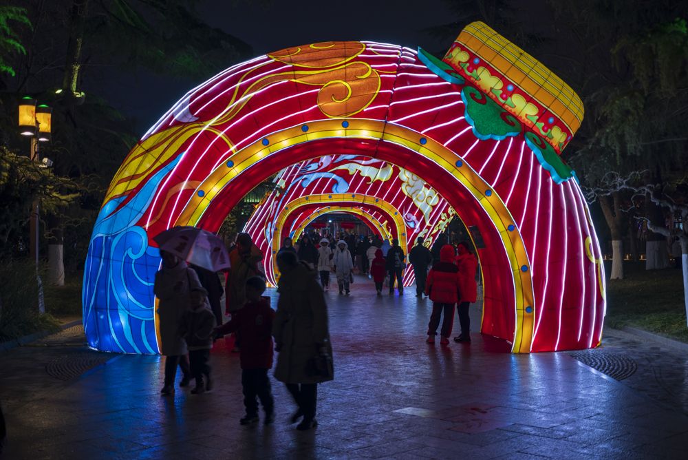 转至五龙潭时,暮色已浓。青石小径旁,灯组“漫时光”以古琴与竹简为形,暖黄的光晕洒在潭水上,与游弋的金鲤共舞,恍若郦道元笔下“净池”的重现。主潭池南岸,祈福河灯缀满水面。一对情侣将莲花灯轻轻推入潭中,灯芯摇曳,映着两人合掌默祷的侧脸。灯影随波荡开,仿佛万千心愿正借泉水之力,流向时光深处。