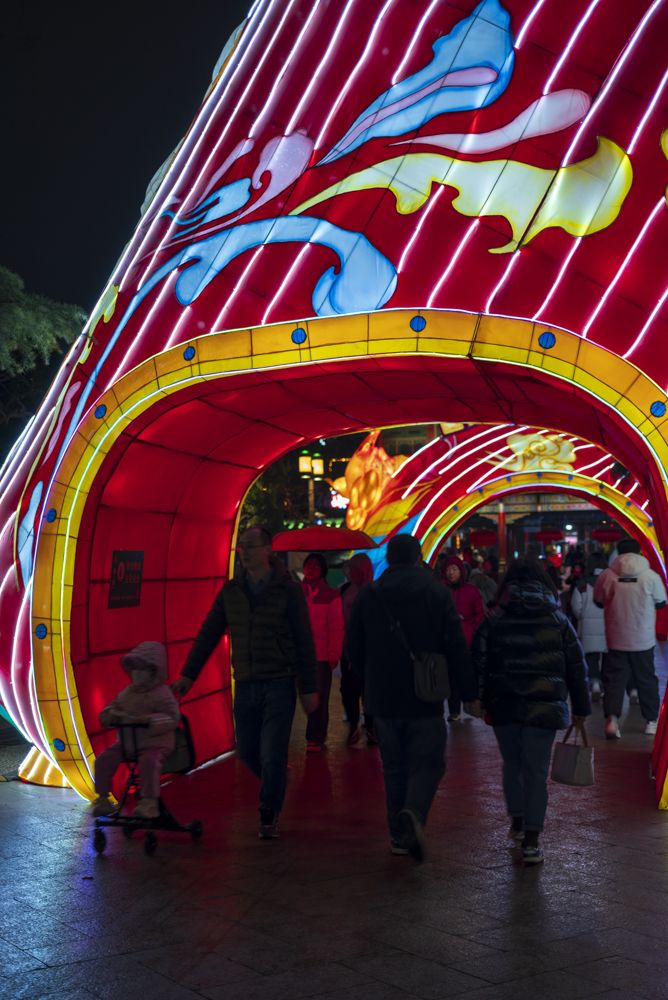 夜愈深,灯愈明。护城河畔,“晚回舟”灯组以船形灯箱为引,再现“曲水流觞”的雅趣;大明湖路残留的市集摊位虽已收束,但“鲤好”文创店的橱窗仍亮着——锦鲤玩偶与“湖畔雨荷”折叠灯静立其中,传统符号被赋予俏皮的现代形态。