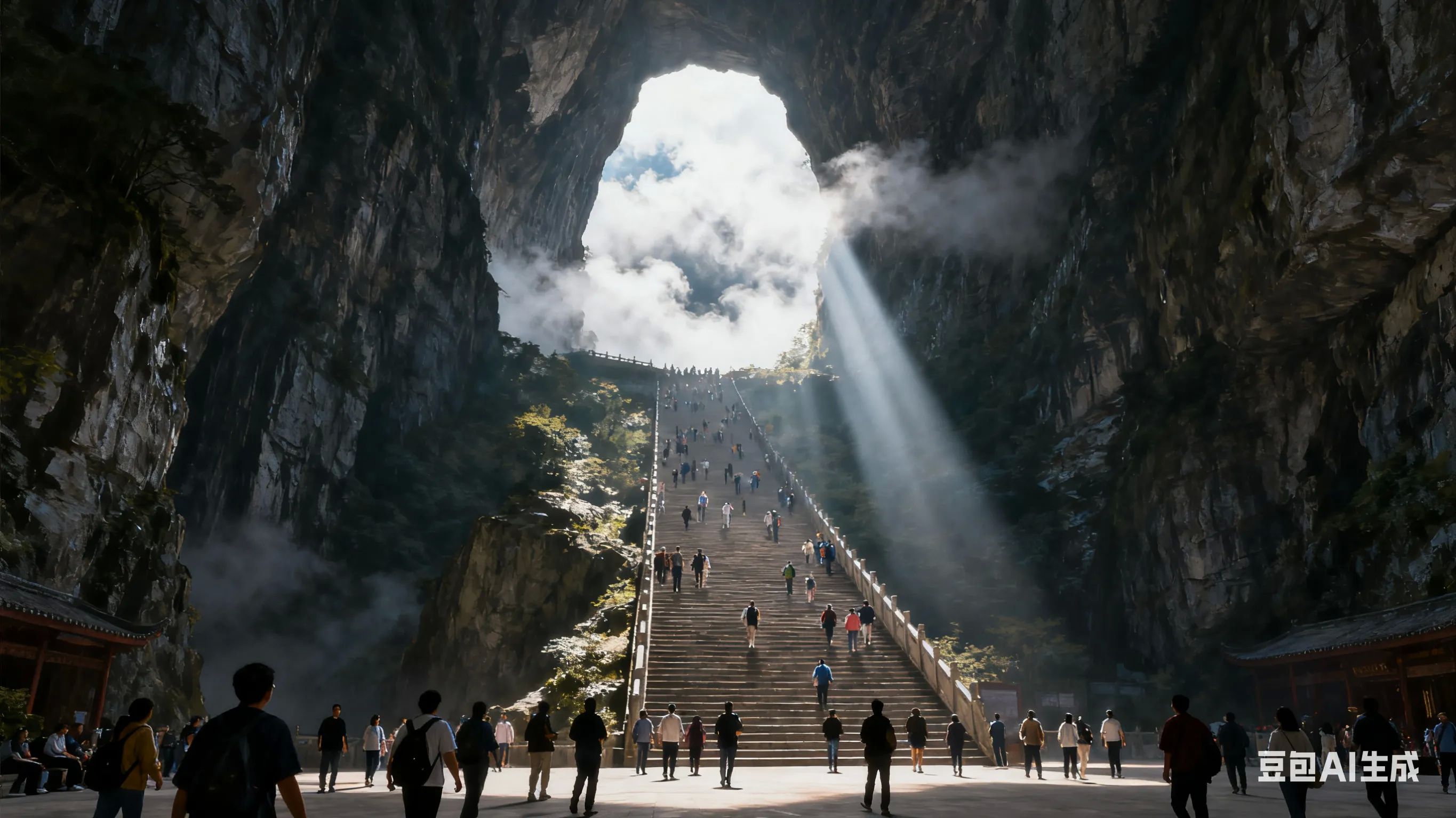 乘穿山扶梯至天门洞,可挑战999级台阶(寓意「步步高升」),在天门洞广场拍「神仙机位」美照,偶遇翼状飞行表演更添震撼。