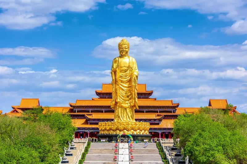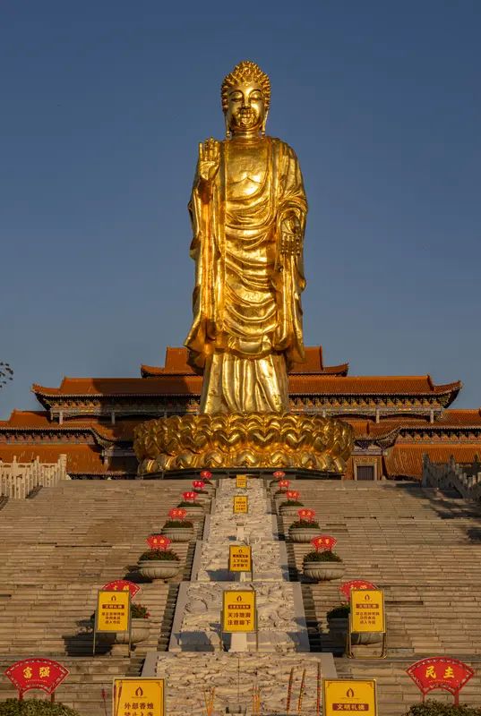 走进寺院,首先映入眼帘的是12座花岗岩牌坊,依次按12因缘、12生肖和12菩萨建造,风格独特,令人叹为观止。核心建筑大雄宝殿平面呈边长80米的正方形,殿内供奉着高17米、重72吨的铜雕鎏金坐像,庄严肃穆。