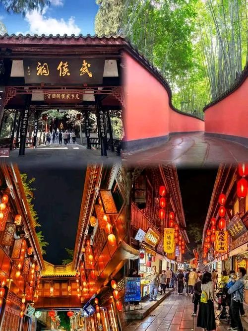 全国唯一的君臣合祀祠庙(刘备与诸葛亮),红墙竹影是拍照的好地方。相邻的锦里古街以三国文化为主题,夜晚红灯笼亮起时,可以品尝三大炮、糖油果子等小吃。
