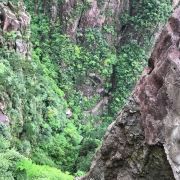 位于温泉旁紫石、朱砂峰间,一源二流,形如“人”字,瀑长50米,如两条白龙直下,声震山谷,气势磅礴。观人字瀑须在雨天或雨后,久晴不雨则难见到。